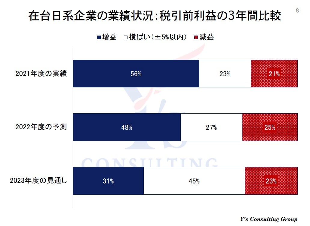 - 台湾における日系企業は増益企業が48%、前年比で8%減少