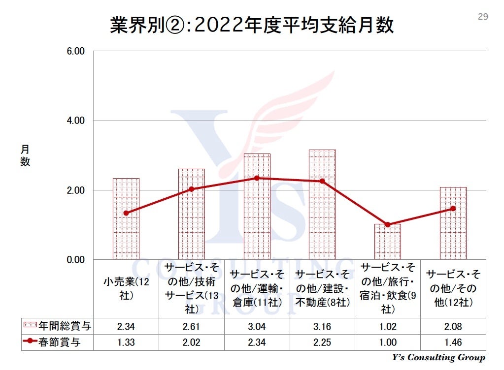 - 22年度の年末賞与平均支給月数は2.07ヶ月、昨年と比較してわずか0.03ヶ月増