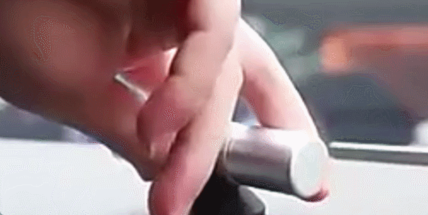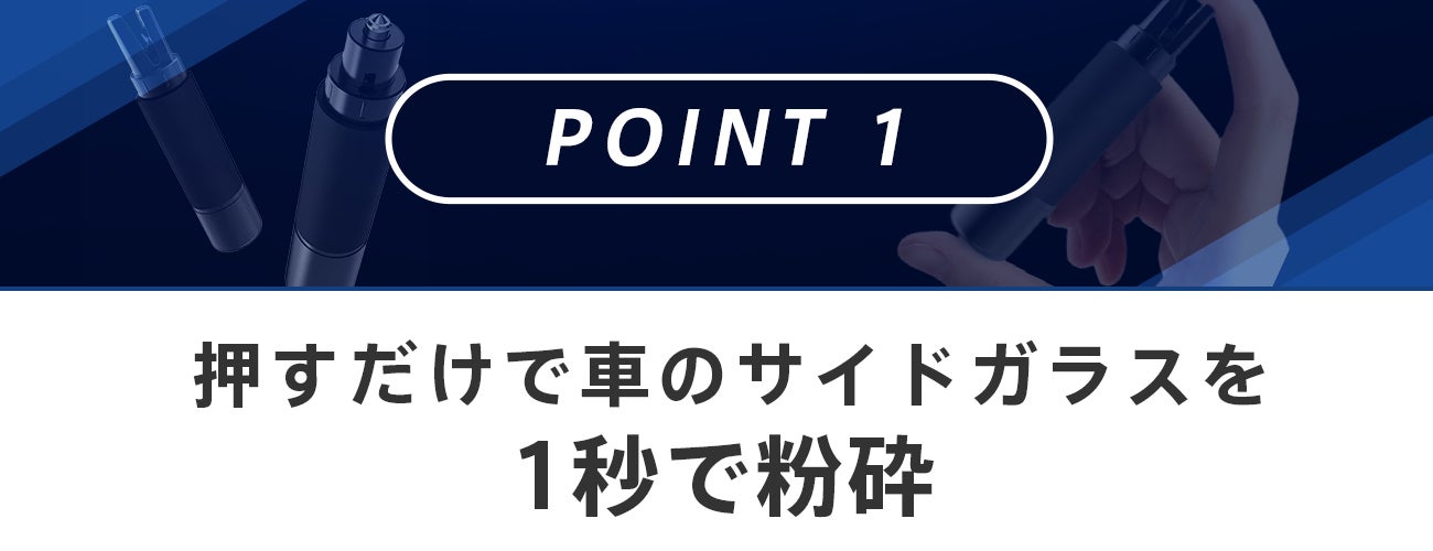 - サイドガラスに押し当て1秒で強化ガラスを粉砕。バネの力でポンチが発動し、女性でも楽に割れる!