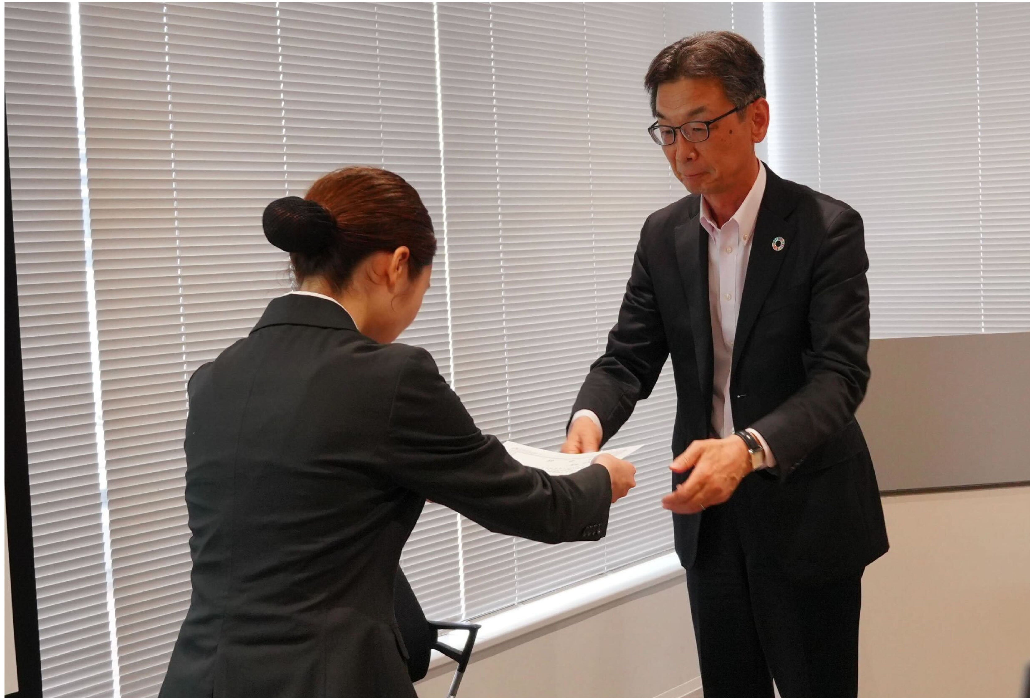 入社式では、代表取締役社長が新入社員へ激励の言葉を述べるとともに、当社の経営理念や目指すべき姿などについて説明しました。また、代表取締役会長をはじめとする社内外取締役からのお祝いのメッセージもあり、新入社員は真剣にメモを取りながらも緊張した表情で耳を傾け、社会人のスタートを切りました。