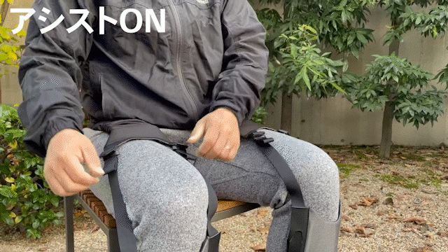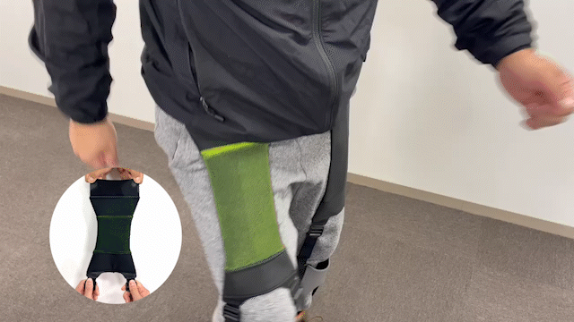 以前リリースしたインナータイプの「DARWING Arukelude」から「登る」動作に特化し、アウタータイプにすることで脚を引き上げるアシスト⼒の調整を可能にしました。ゴム製の⼈⼯筋⾁を太もも部分に内蔵。座った状態でベルトを引っ張って装着することで太もも部分の⼈⼯筋⾁のゴムが伸び、坂道や階段などの登り動作で⼈⼯筋⾁の収縮⼒により脚を上げる動作をアシストします。また、脚上げアシストによりつまづきを防ぎます。
