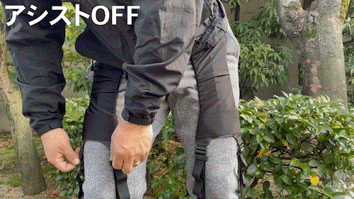 例えば平坦な道を歩く際は、ベルトを緩めることで脚の引き上げアシストをOFFにできます。DARWING Arukelude PROはアウタータイプになっているのでアシストのON/OFFや調整・着脱が簡単に行えます。