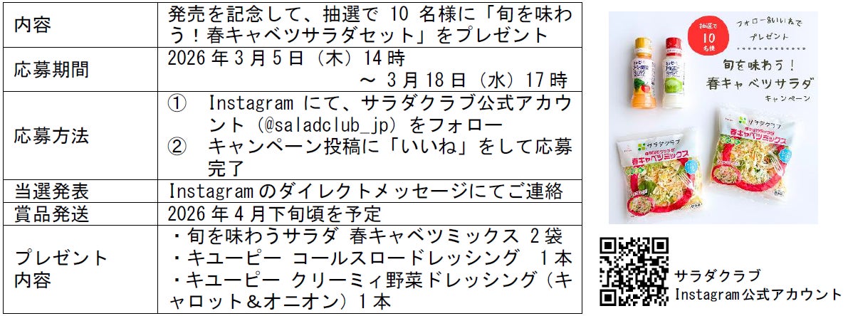 株式会社サラダクラブ(代表取締役社長:新谷昭人、本社:東京都調布市)は、春キャベツを使用した「旬を味わうサラダ 春キャベツミックス」(140g/税込237円)を2026年3月13日(金)〜5月14日(木)までの期間限定で販売します。