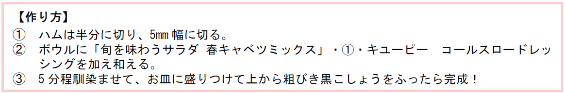 春キャベツの甘さを生かした、こどもも食べられる簡単レシピのサラダです。ハムの代わりにツナやカニカマでもおいしく作れます。