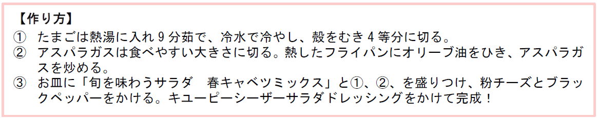 シャキシャキのキャベツとレタスに甘いコーンがアクセントのサラダに、香ばしく炒めた旬のアスパラとゆで卵を添えた、目にも鮮やかな一皿です。食卓がパッと明るくなる春らしいごちそうサラダです。