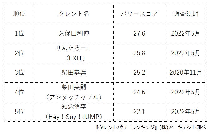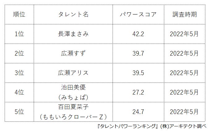 本ランキングは、2022年5月度に実施したタレント調査データ(一部過去実施データ)を利用し、タイトルに応じてランキング形式でまとめたものです。