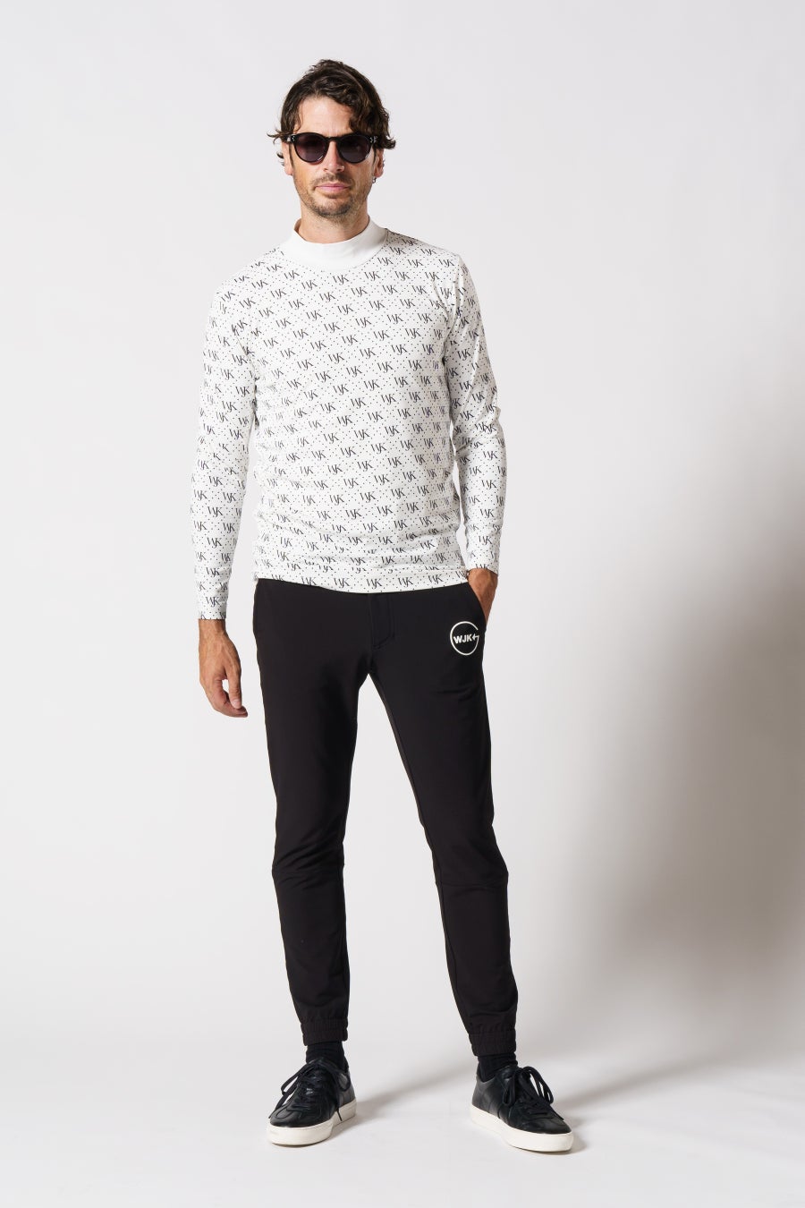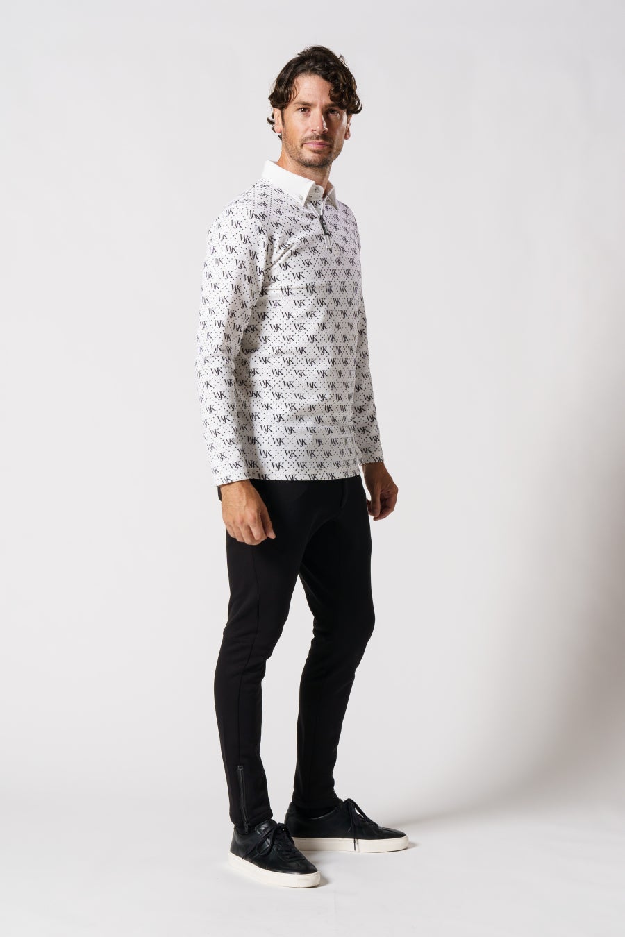 インパクトのあるロゴ入りテキスタイルを使用したロングスリーブポロシャツ。総柄プリントで斬新な仕上がりに。 ボタンダウン仕様の衿が全体感なイメージに締まり感を与える。