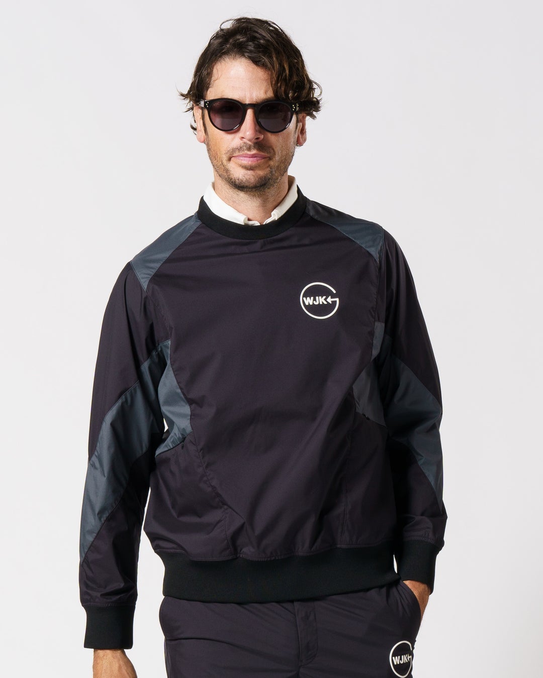 バイカラーの切り替えデザインが特徴的なクルーネックプルオーバータイプのウインドブレーカー。 ウエスト部分の切り換えを利用したシームポケットもポイント。バックスタイルは大胆にブランドロゴをプリント。