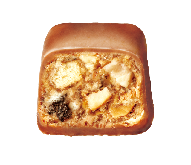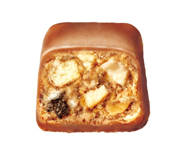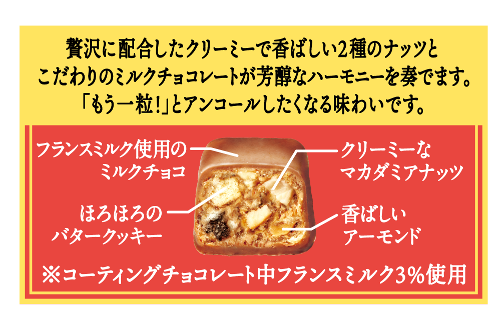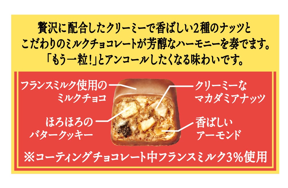「ナッツの王様」と呼ばれるクリーミーな味わいが特徴のマカダミアナッツを製品中11.4%、香ばしいアーモンドを製品中5.0%配合しました。また、自社特製のバタークッキーと組み合わせることでローストしたナッツの香ばしい香りと、カリッとした食感を引き立たせています。チョコレートには、しっかりとしたミルキーな味わいが特長のフランスミルクを使用したミルクチョコレートをコーティングしコク深い濃厚な味わいに仕上げました。
