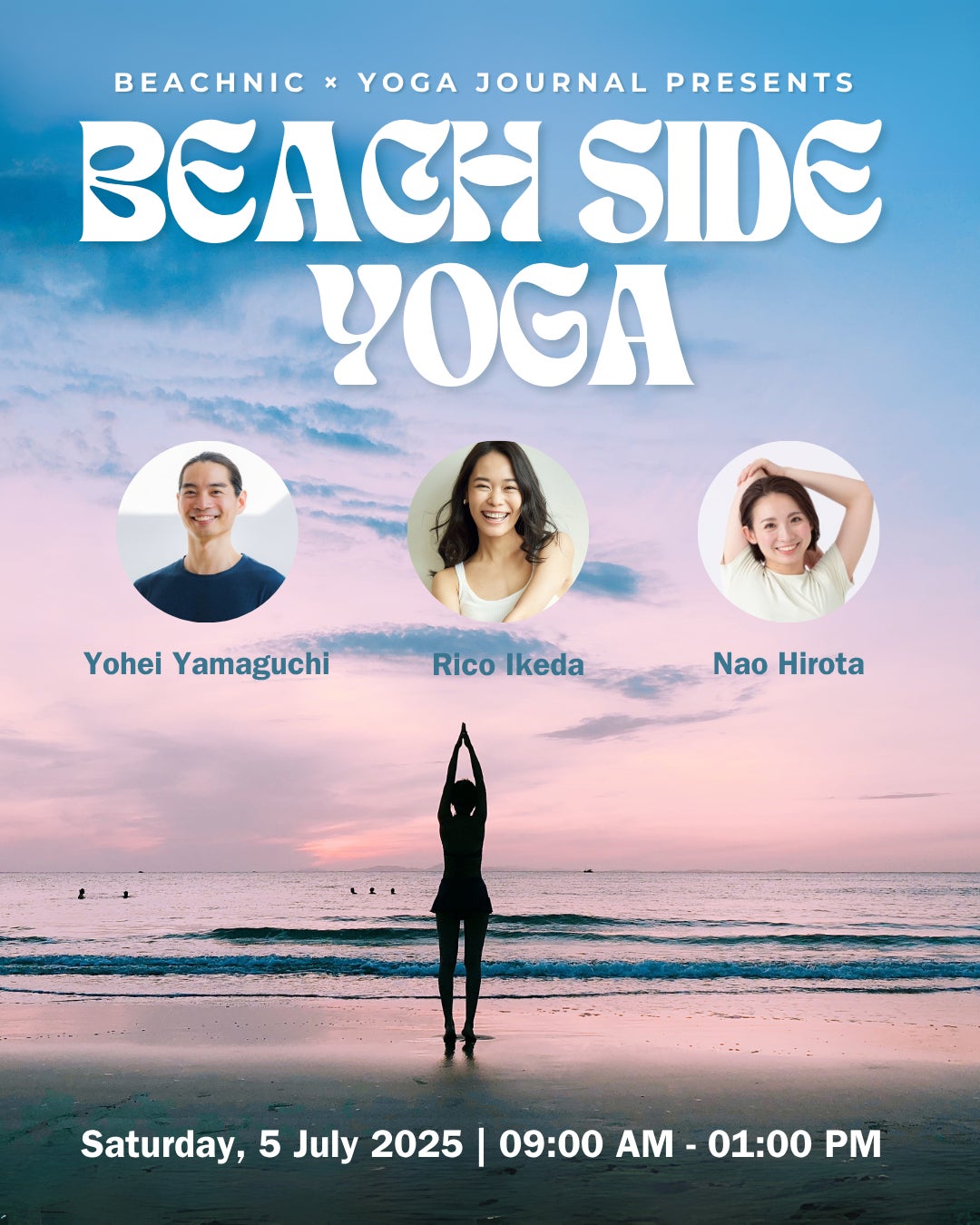 ヨガの専門誌&オンラインメディアを運営する「ヨガジャーナル」がプロデュースするヨガクラスの開催が決定! 各種メディアをはじめ、大型イベントにも登壇する人気ヨガ講師3名によるスペシャルレッスンです。参加費は、最新号『ヨガジャーナル日本版』2025年夏号(vol.97)のほか、豪華お土産がついて各回2,000円! ぜひお見逃しなく。なお、エントリー方法などの詳細はBEACHNICオフィシャルHPおよびInstagramで発表しますのでフォローしてお待ちください!