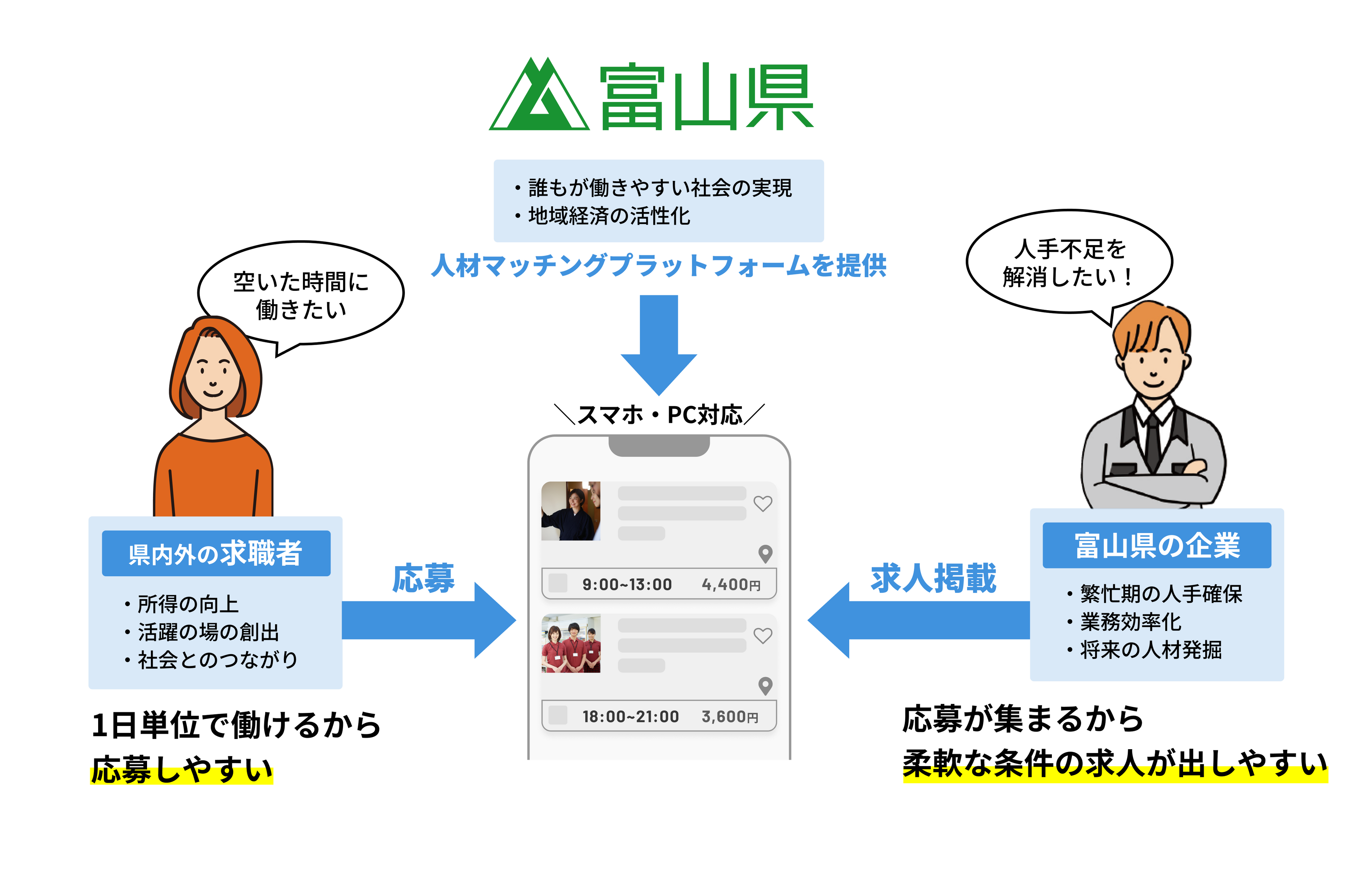 富山県は本事業を通じ、県内企業の人材確保を支援すると同時に、スポットワークの普及による柔軟な就業機会の創出を図り、多様な人材が活躍できる持続可能な地域社会の実現をめざします。