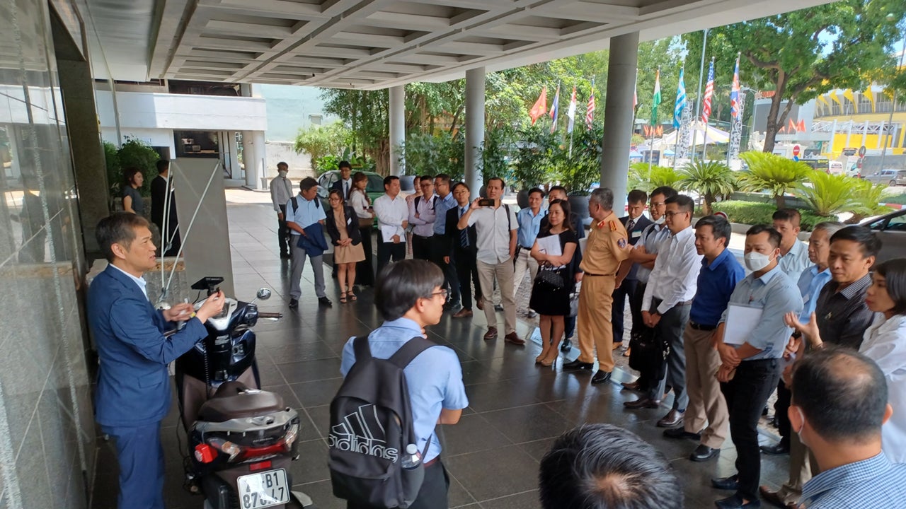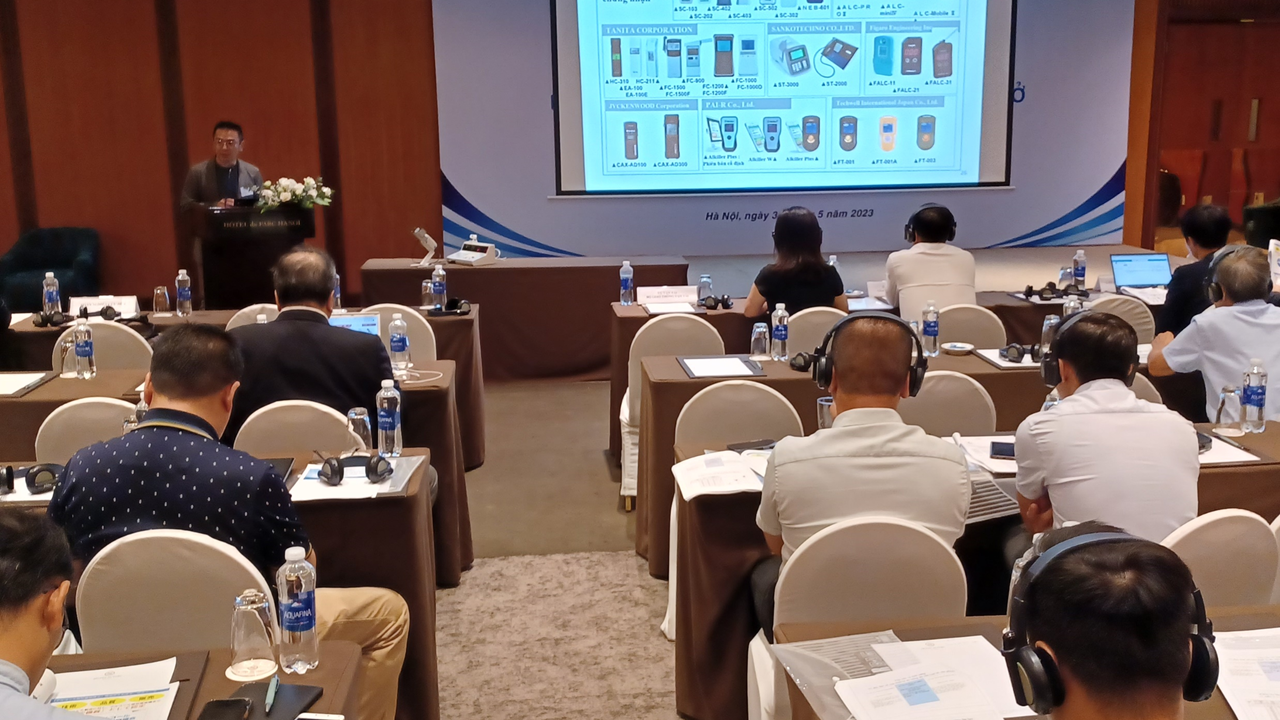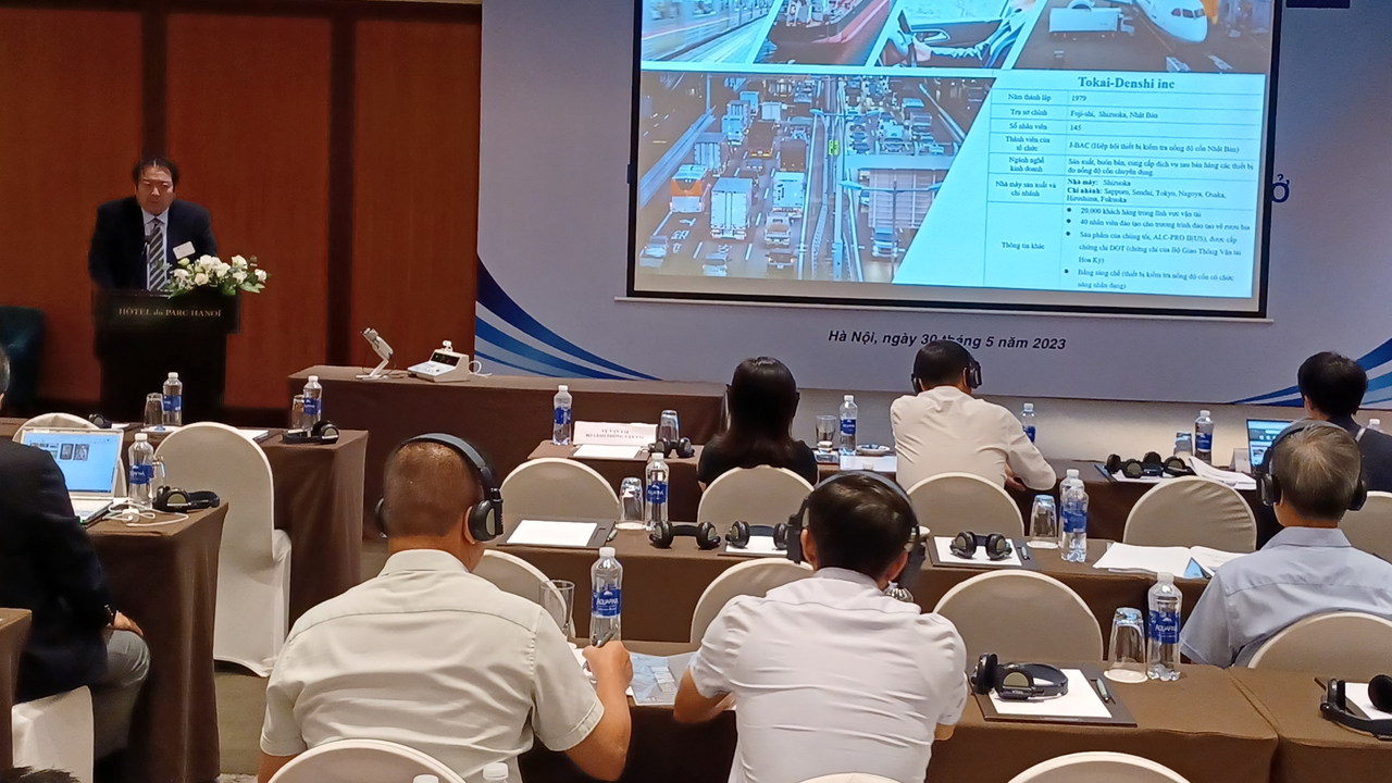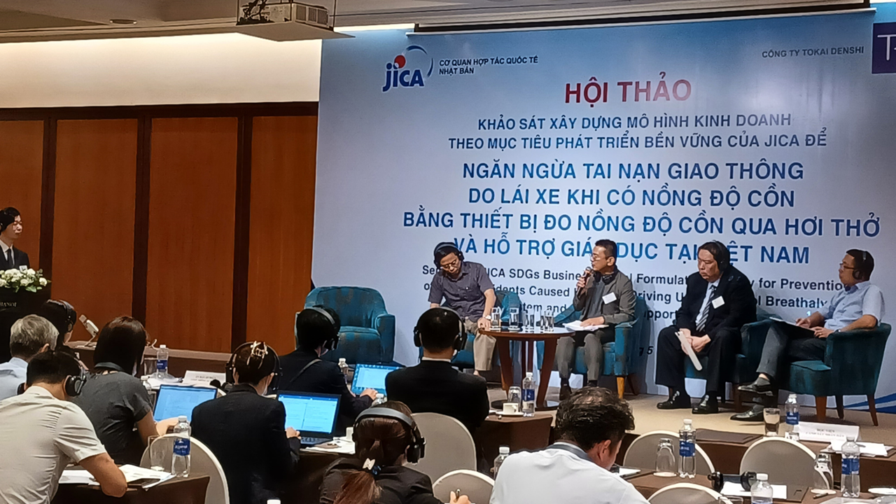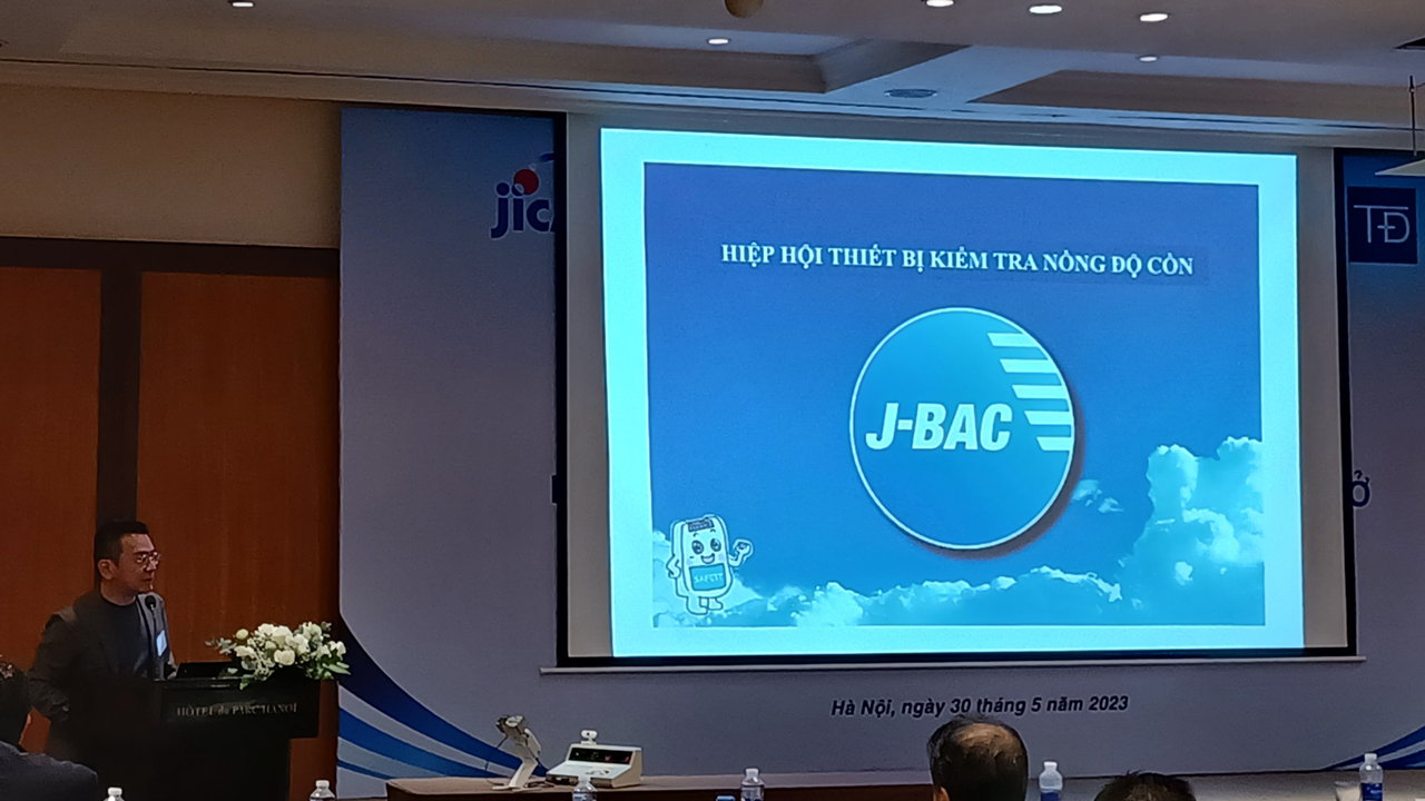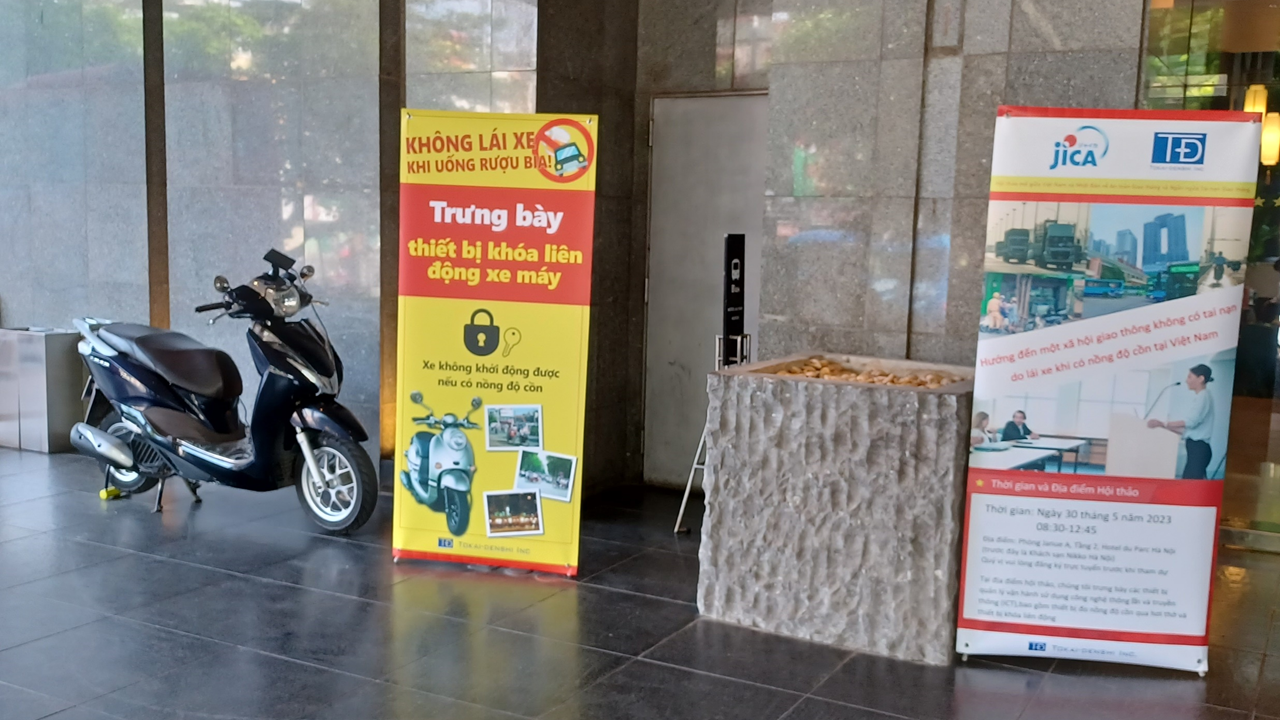 本セミナーは、ベトナム政府交通関係者による基調講演、ハノイ市バスの実証成果報告、⽇本のアルコール検知器業界団体(J-BAC)の活動紹介、アルコール検知器メーカー(東海電⼦)による製品紹介、 各種アルコール検知器展⽰、パネルディスカッション、オートバイアルコールインターロック実演、といった内容で構成されていました。