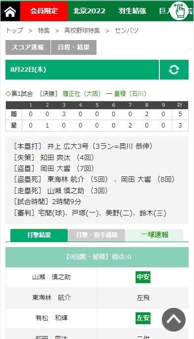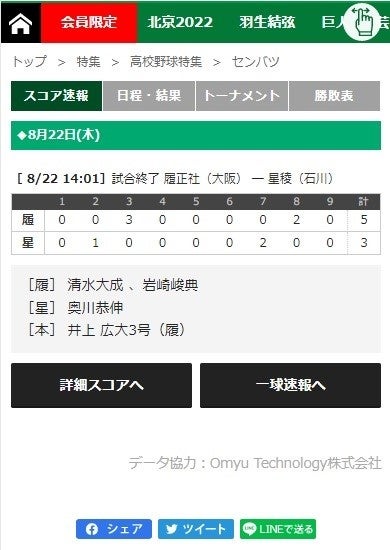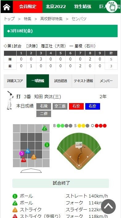 進行中の試合のスコア表示はもちろん、両校の出場選手成績やイニングごとの攻撃内容詳細などの情報も満載。試合の流れを一気に追うことが可能です。