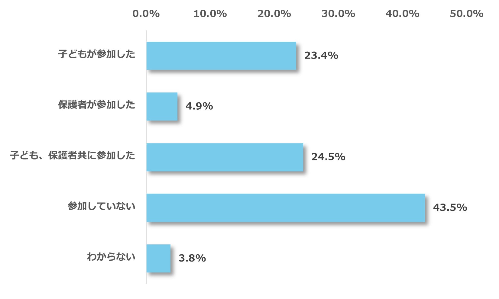 次に、オープンキャンパスに参加したことがあるか質問したところ、「子どもが参加した(23.4%)」、「保護者が参加した(4.9%)」、「子ども、保護者共に参加した(24.5%)」という結果に。合わせると、高校生のいる家庭の52.8%がオープンキャンパスに参加していることがわかりました。