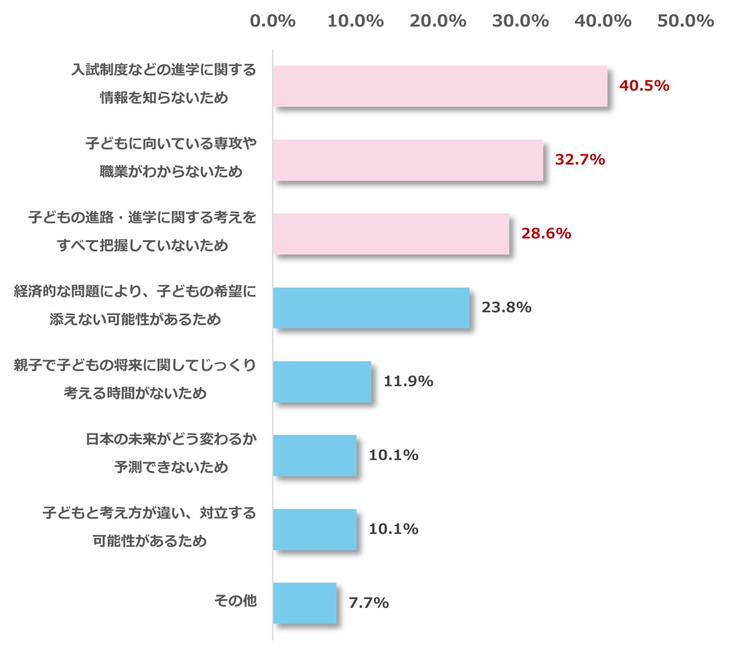 子どもから進路相談を受けた際、有益なアドバイスができないと思うと回答した168名を対象に、その理由を質問したところ、最多回答は「入試制度などの進学に関する情報を知らないため(40.5%)」、次に「子どもに向いている専攻や職業がわからないため(32.7%)」、「子どもの進路・進学に関する考えをすべて把握していないため(28.6%)」と続きました。