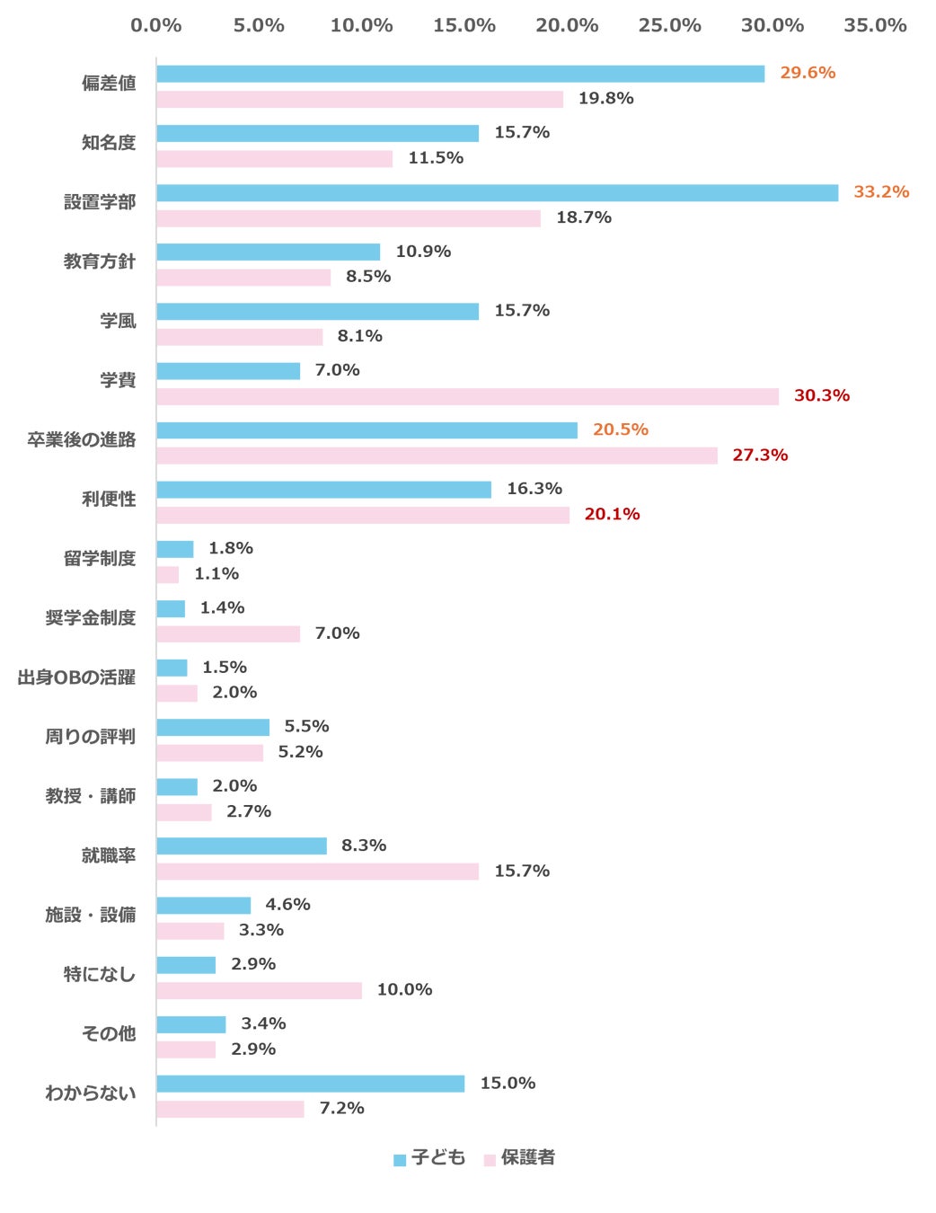「設置学部」については14.5ポイント、「学費」については23.3ポイントと大きな差があることがわかります。これらの結果から、子どもと保護者では、志望校選びで重視する内容に違いがあることがわかりました。