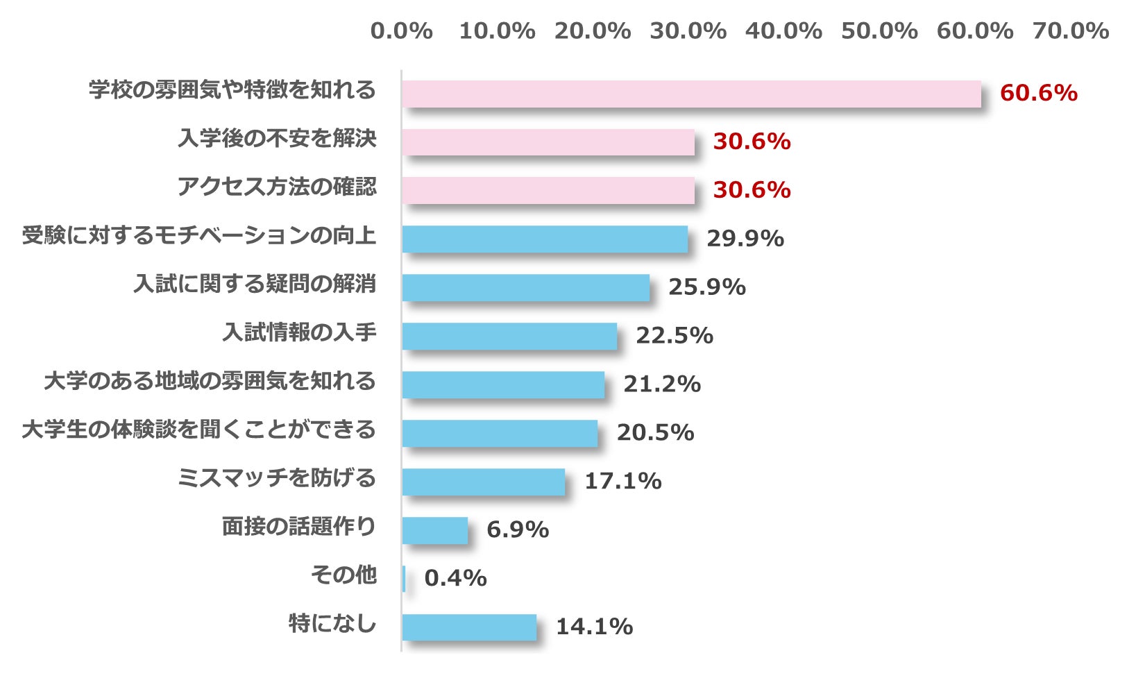 オープンキャンパスに対して何を期待しているか質問したところ、最多回答は「学校の雰囲気や特徴を知れる(60.6%)」、次に「入学後の不安を解決(30.6%)」、「アクセス方法の確認(30.6%)」が並びました。