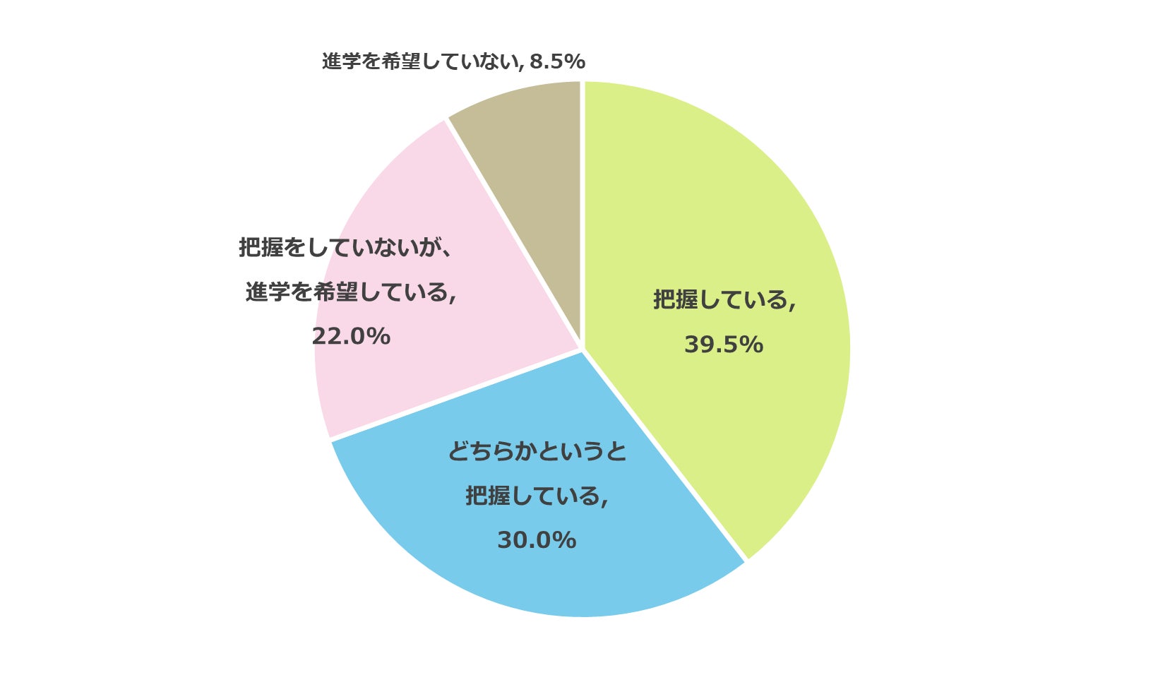 高校生の保護者800名を対象に、子どもの志望校を把握しているか質問したところ、69.5%が「把握している」(把握している:39.5%、どちらかというと把握している:30.0%)と回答しました。