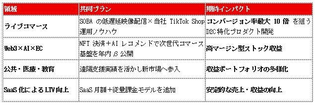 株式会社SOBAプロジェクトを迎え入れることで、売れるネット広告社グループは 「映像配信の特許技術」×「TikTok Shop運用ノウハウ」×「Web3・AI決済インフラ」 を一挙に内製化し、①ライブコマースの最適化プロダクトを即時に商品化、②NFT決済とパーソナライズAIを統合した“買う AI”時代の次世代コマース基盤を先行リリース、③遠隔医療・オンライン教育・Web会議といった公共性の高い市場へ新規参入、④コンサル主体のフロー収益にSaaSサブスクを重ねることでキャッシュフローをストック化——という四重のシナジーを同時に発揮できる体制が整います。