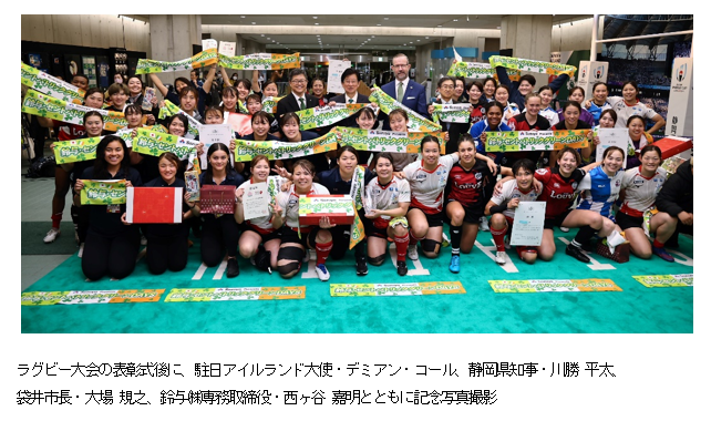 アイルランドの祭日「St. Patrick’s Day」にちなんで、お茶やメロンなど緑で親和性のある静岡県とアイルランドとの友好の表れとして、2021年より7人制女子ラグビー大会『鈴与・セントパトリックグリーンカップ』を支援しています。本年は、上位4チームが上位大会のコアチームに昇格する『Regional Women’s Sevens 2022 (女子7人制ラグビー)』と併催されたことに加え、同日エコパ特設コースにて開催された自転車競技『2023 JBCF CYCLE ROAD SERIES 第1回袋井・掛川ロードレース』を合わせて『鈴与・セントパトリックグリーンDAYS』として開催されました。ラグビー大会では全9チームが熱戦を繰り広げ、ナナイロプリズム福岡が優勝。表彰式にはデミアン・コール駐日アイルランド大使や川勝平太知事が出席しました。
