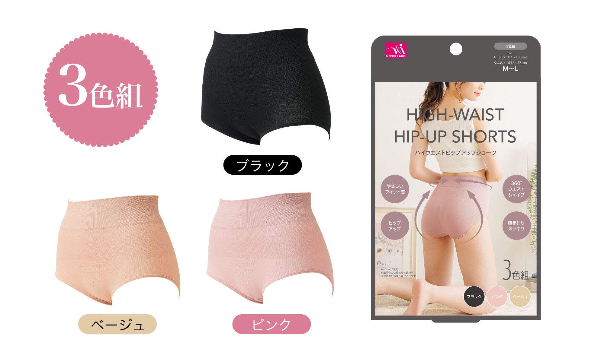株式会社ニーズ/株式会社サンファミリー(本社:兵庫県加古川市、代表取締役:本岡勝則)は、「ハイウエストヒップアップショーツ 3色組」2,178円(税込)を8⽉21⽇(月)より発売開始しました。