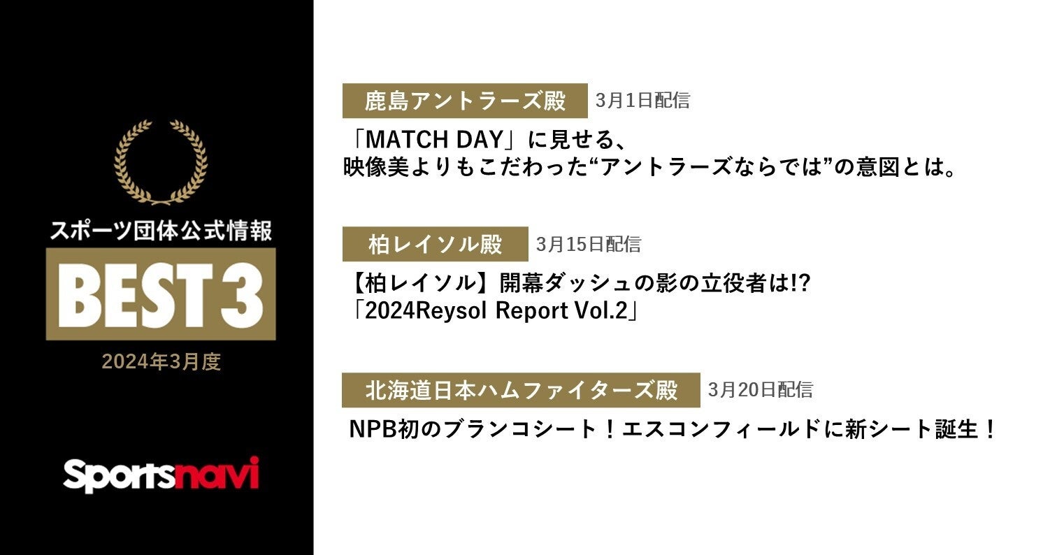 【公式】鹿島アントラーズ、柏レイソル、北海道日本ハムファイターズが受賞! スポーツ団体公式情報月間ベスト3(2024年3月度)