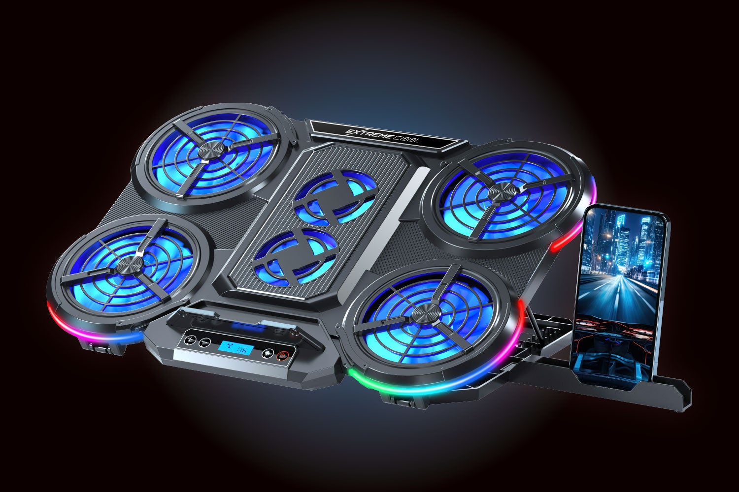 ファン6基で冷却、RGBイルミネーションで発光、液晶ディスプレイでカスタマイズ、スタイルに合わせて角度調整できるゲーミングノートPCクーラーEXTREME COOLが発売。