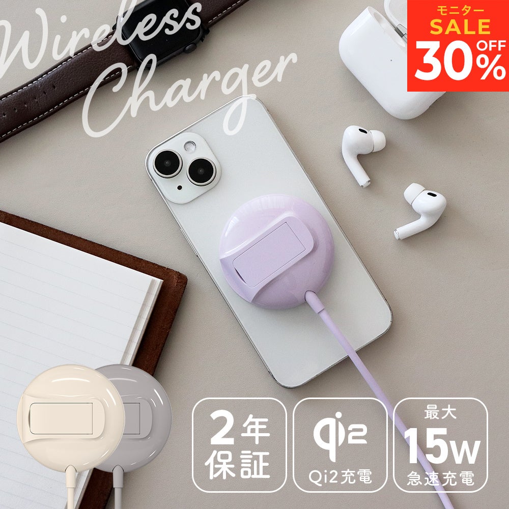 ワイヤレス充電がさらに簡単にできるQi2対応充電器です。磁石の力で端末の充電位置に近づけるだけで、ピタッと装着可能です。