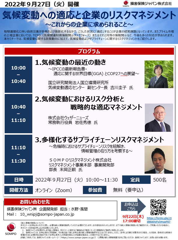 損害保険ジャパン株式会社(代表取締役社長:白川 儀一、以下「損保ジャパン」)は、オンラインセミナー「気候変動への適応と企業のリスクマネジメント~これからの企業に求められること~」を開催いたしますので、お知らせします。