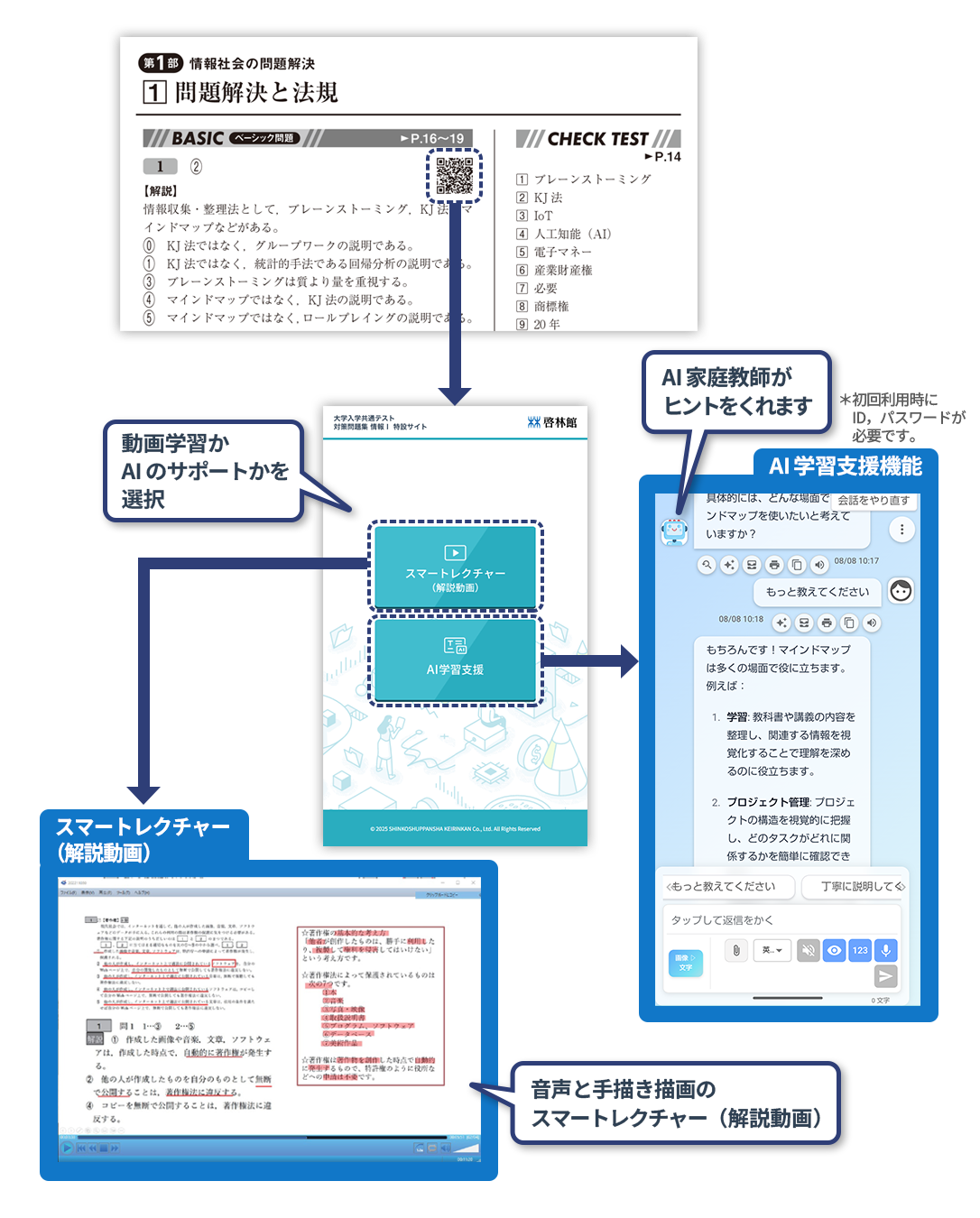 本教材では、当社の「スクールAI」を基盤とした「AI Smart Lecture」を通じて、問題集に掲載されたQRコードからアクセスし、AIとの対話を通じた学習支援を受けることができます。