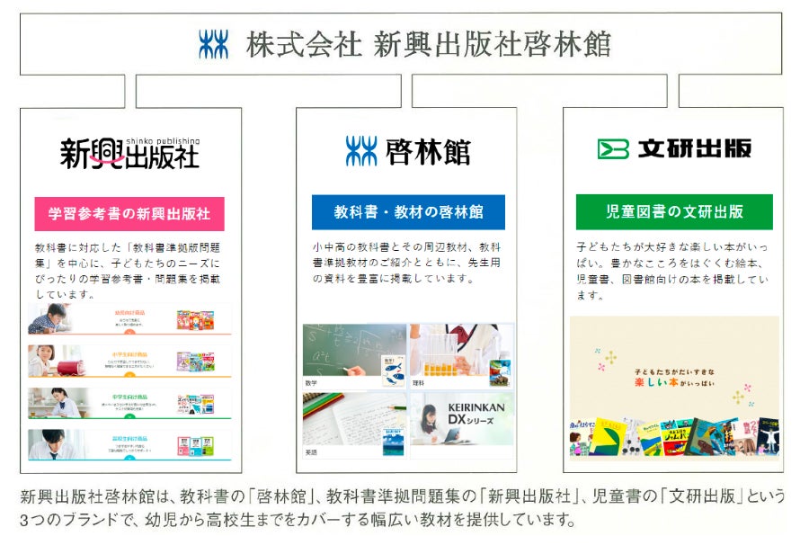 ⼩学校 ・中学校・⾼等学校の教科書・教材、児童図書、ICT教材などを制作・販売し、 学校現場をサポートしている出版社です。「新興出版社」「啓林館」「⽂研出版」3 つのブランド名で⼦どもたちの未来を創造する教材を提供しています。