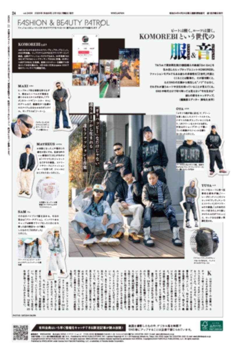 「WWDJAPAN」の人気&定番連載の裏表紙コーナー「ファッション&ビューティパトロール」では、TikTokで累計再生数23億回超えの楽曲「Giri Giri」を生み出したヒップホップユニットのKOMOREBIにフォーカス。ファッションモデルでもある彼らのファッションを徹底解剖します。
