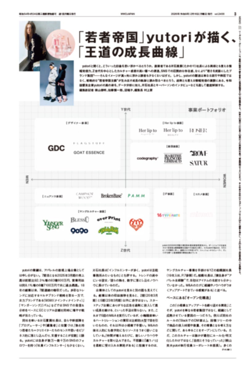 「WWDJAPAN」2月16日号は、「yutori特集」です。yutoriと聞くと、どういった印象を思い浮かべるでしょうか。創業者である片石貴展(たかのり)社長による異様とも言える情報発信力、Z世代を中心としたカルチャー感度の鋭い層への浸透、SNSでの圧倒的な存在感、そして“若さを武器にしたブランド集団“――そんなイメージが真っ先に浮かぶ人も少なくないはずです。しかし、yutoriの躍進は単なる流行や熱狂ではなく、戦略的な“若者帝国主義“が生み出す成長曲線として読み取るべきです。