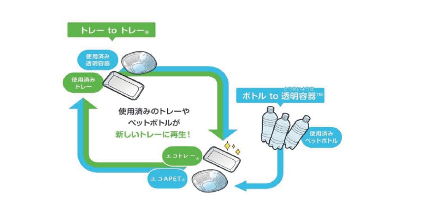 エフピコはエフピコ方式のリサイクルによる地上資源の循環およびCO2排出量削減、環境負荷の低い容器の開発による省資源化などを通じて、「持続可能な社会の実現」を目指しています。使用済み食品トレーを新たな食品トレーに生まれ変わらせる「トレーtoトレー」、及び使用済みペットボトルを回収し新たな透明容器に生まれ変わらせる「ボトルto透明容器」において、エコ製品「エコトレー」「エコAPET」を製造しています。