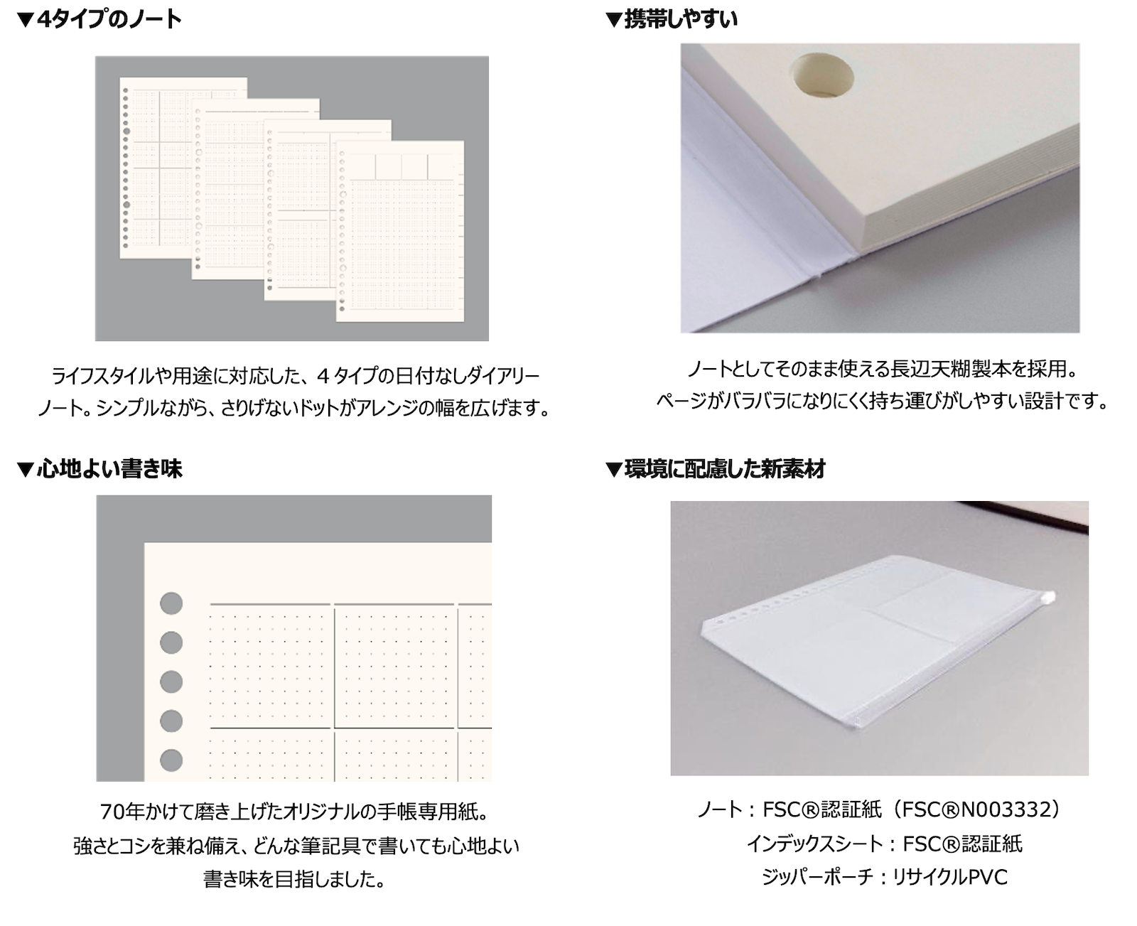 従来のノートタイプのラインナップに加え、新たにA5サイズの日付なしタイプのダイアリーが4種新登場。