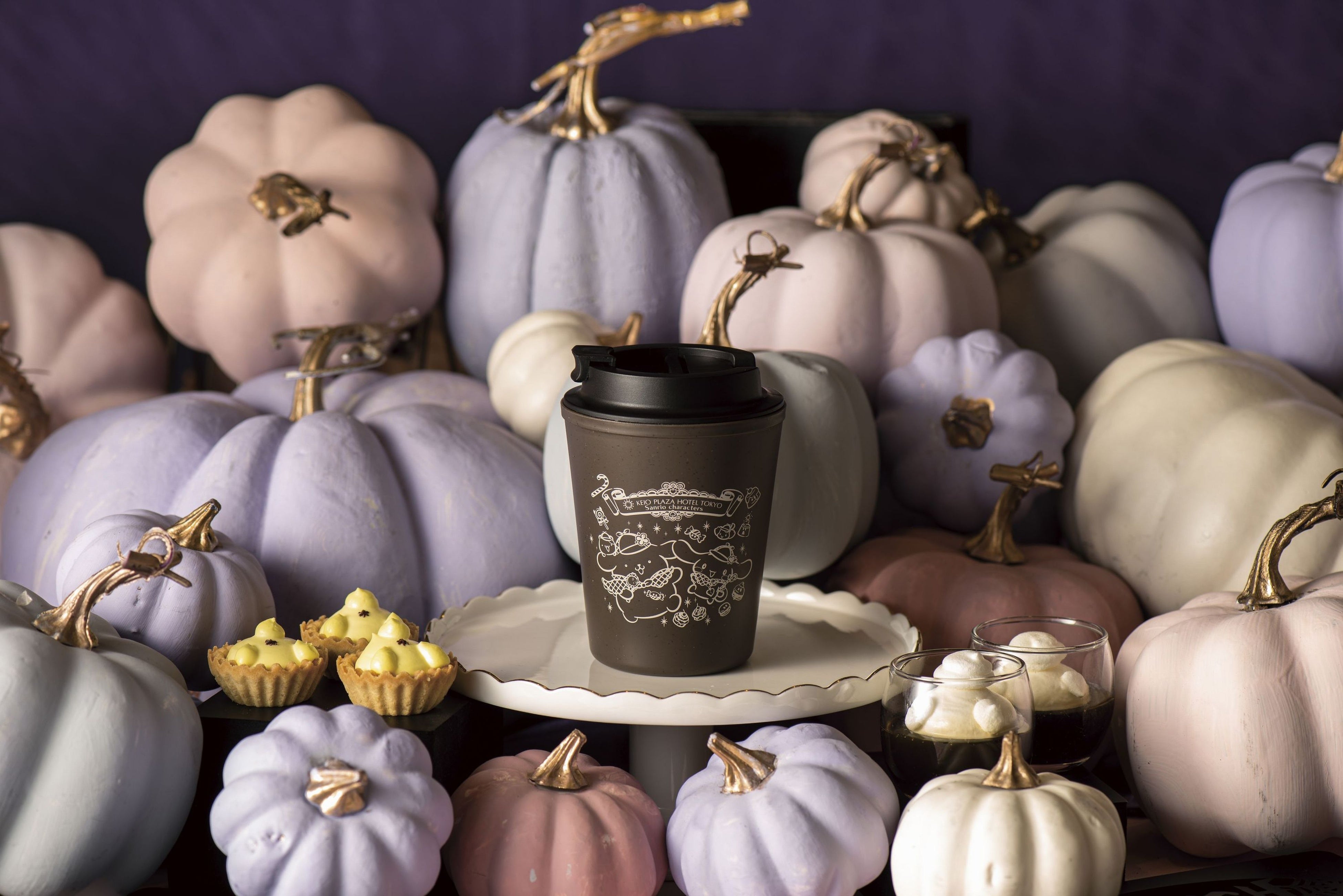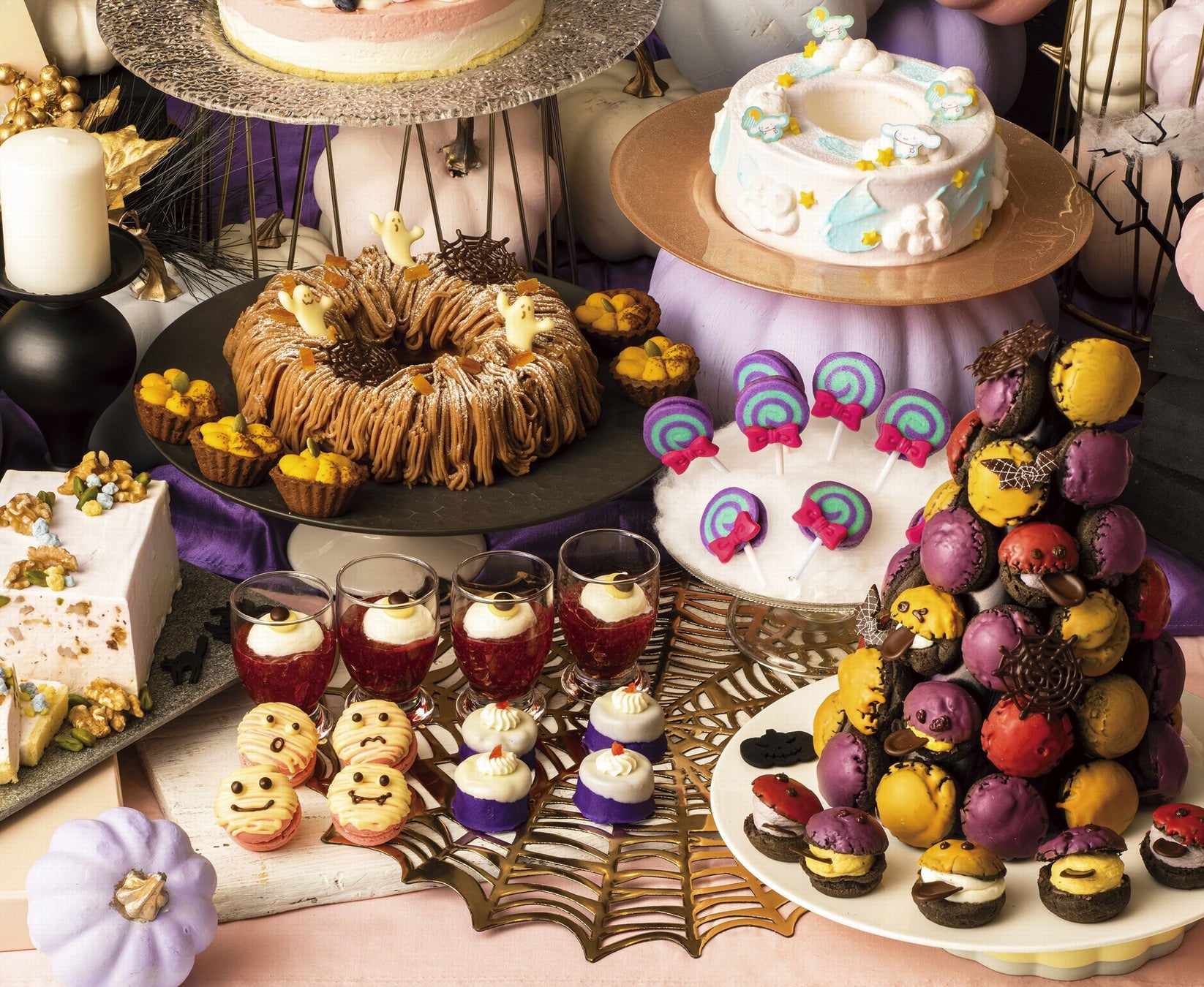今回のためだけに描き起こされたイラストに登場する謎の怪しい見た目のスイーツを模した、おばけのクッキーシューやプリンみたいなスイートポテト(紫芋味)をはじめ、パティシエが創作したミイラマカロン、ひとつ目ゼリーなどが2日間限定のラインナップとなります。人気の「ポムポムプリン」や「シナモロール」を連想するスイーツも継続し提供いたします。