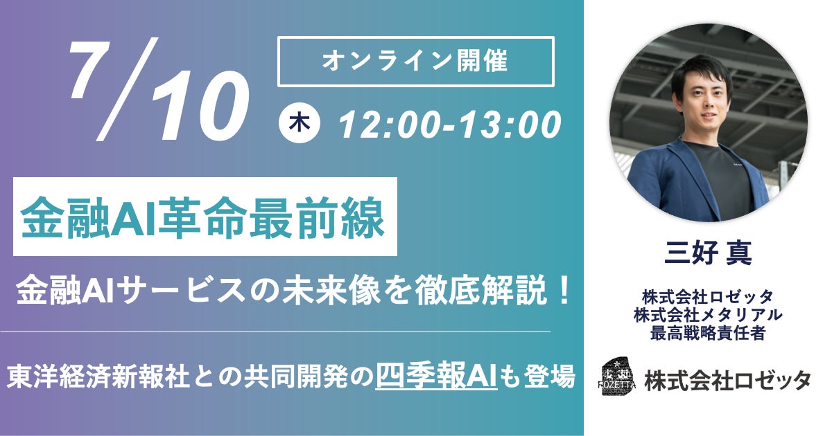 株式会社メタリアル・グループで、国内市場No.1※のAI翻訳サービスを開発・提供する株式会社ロゼッタ(代表取締役:五石 順一)は、「金融AI革命最前線|金融AIサービスの未来像を徹底解説」を7月10日(木)に開催いたします。