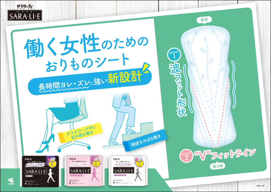 独自のウェットフリーシート採用により、水分をすばやくシート内部に引き込み、表面におりものが残りにくくサラサラ感が続きます。働く女性の1日の動きに合わせたヨレずれしにくい波型のシート形状と”V”字型ラインを今秋に新導入しました。