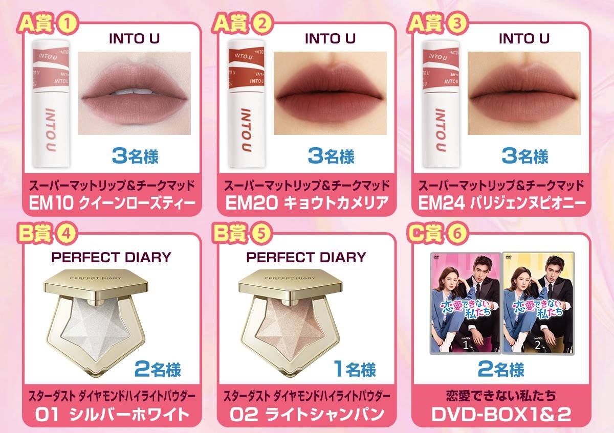 アジアで500万本以上を売り上げた話題の中国コスメ「INTO U」の“泥リップ”こと「スーパーマットリップ&チークマッド」から品切れ続出の人気カラー3色と、日本での中国コスメの火付け役として知られる「PERFECT DIARY」から、SNSで“まるで塗るダイヤモンド”と大バズリ中の「スターダスト ダイヤモンドハイライトパウダー」2色、そして人気急上昇中のドラマ「恋愛できない私たち」のDVD-BOXを抽選で計14名様にプレゼント!