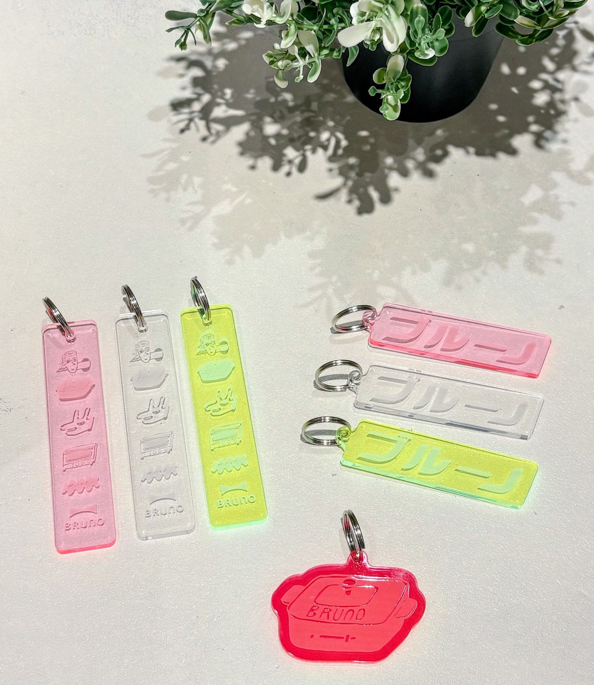 BRUNOをイメージしたイラスト入り、ホットプレートモチーフ、珍しいカタカナロゴデザインの3種がラインナップ。トレンドのネオンカラーで、お気に入りのポーチやバッグのワンポイントにも!