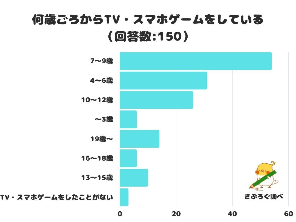2位以降は、「4〜6歳」、「10〜12歳」と続き、「TV・スマホゲームをしたことがない」は8位という結果になりました。