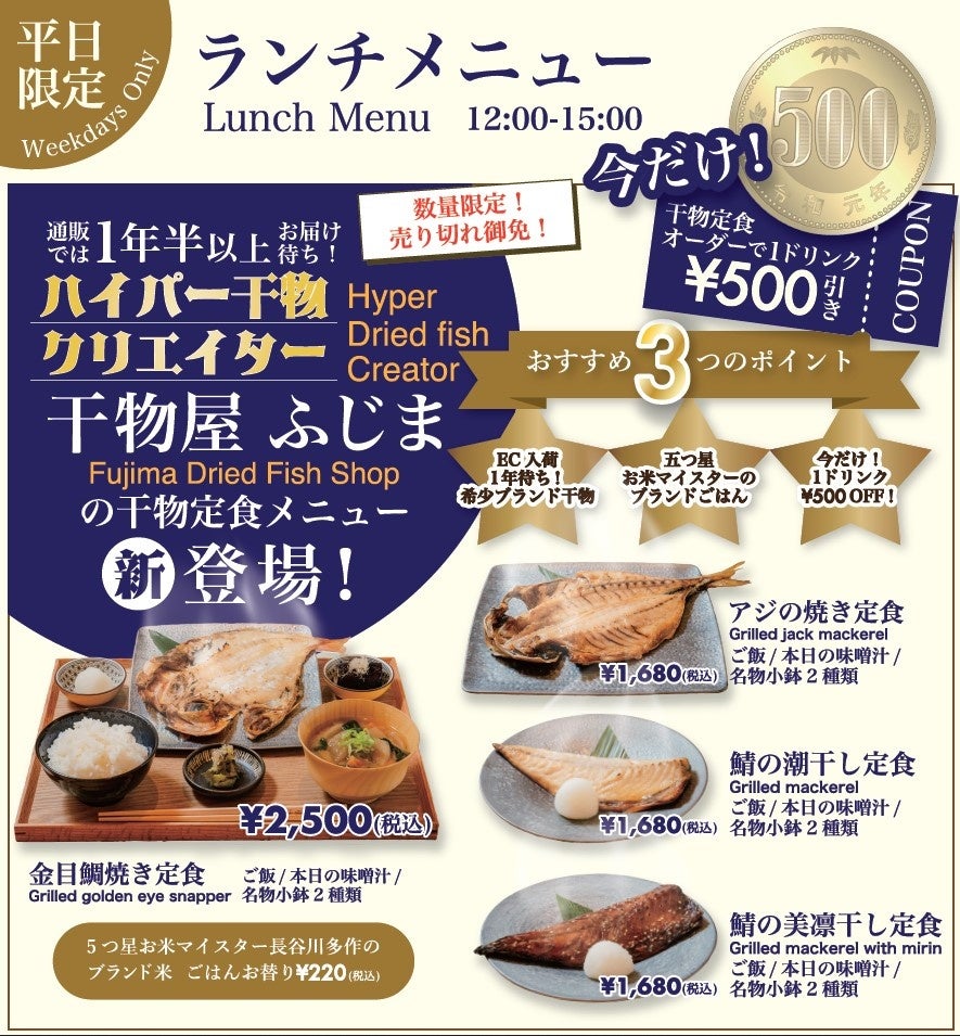 SAKEペアリング酒場「米三角」(所在地:東京都江東区、運営:株式会社浜友E.F.)は、日本一の中央卸売市場の食のテーマパークである【豊洲千客万来】から、「国内外へ日本の「干物」食文化・日本ソウルフードのすそ野を広げたい」との想いで、熱海市のハイパー干物クリエイターが作る絶品干物「干物屋ふじま」を6月より単品メニューとして販売スタートしましたが、9月17日より平日月~金曜(祝日除く)12:00~15:00の時間帯限定干物定食メニューとして販売をスタートします。