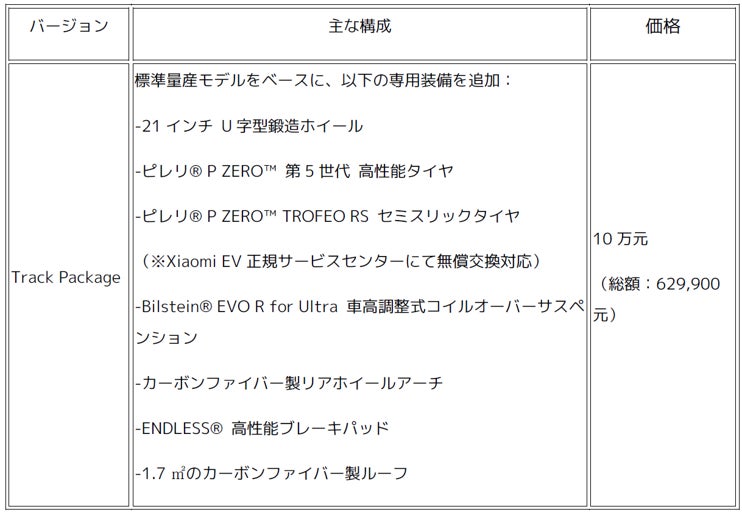 スタンダードモデルの「Xiaomi SU7 Ultra」は529,900元から。サーキット走行に特化した「Track Package」は追加オプションとして100,000元で提供され、フル装備での価格は629,900元となります。