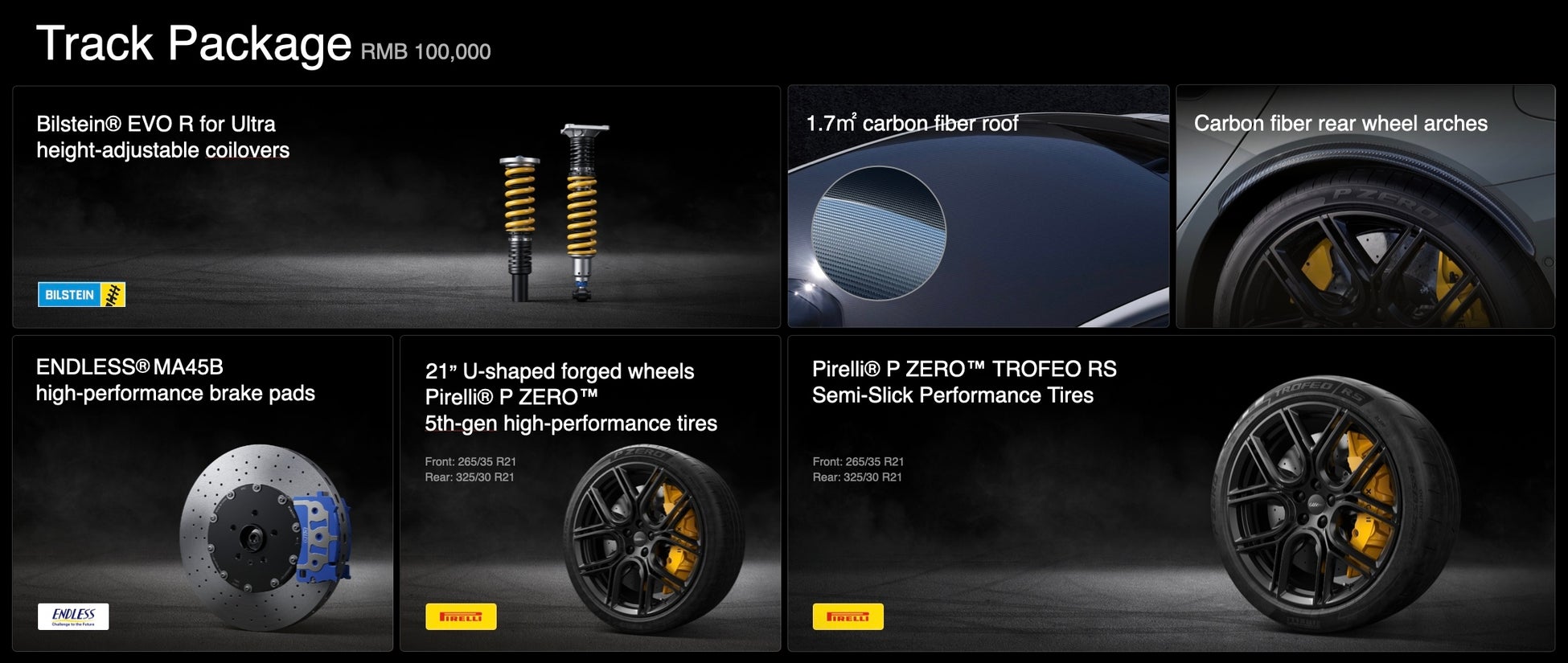 さらにサーキット性能を極めたいエンスージアストのために、オプションの「Track Package」を用意。このパッケージには、Bilstein製「EVO R for Ultra」車高調ショックアブソーバー、ENDLESS製高性能ブレーキパッド、ピレリ第5世代「P ZERO」高性能タイヤ、ピレリ「P ZERO TROFEO RS」セミスリックタイヤ(別途1セット)、21インチU字型鍛造ホイール、カーボンファイバー製リアフェンダー、1.7㎡のカーボンファイバー製ルーフが含まれます。