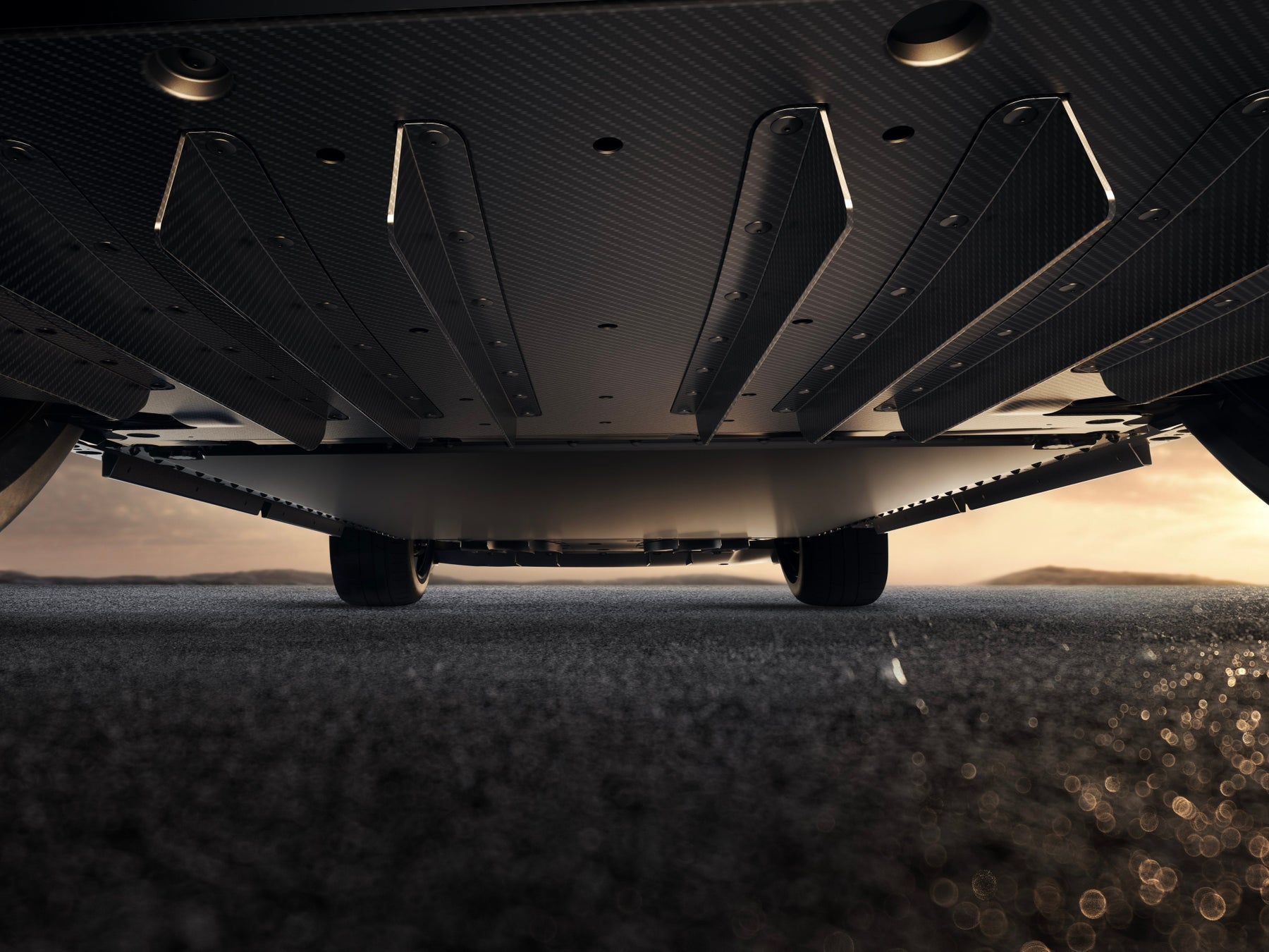 その性能は、極限スペックのさらに先へ。前席にはFIA認証のカスタムカーボンファイバー製レーシングバケットシートと、競技仕様の6点式シートベルトを標準装備。後部座席は取り外され、代わりにセミロールケージを搭載することで、ねじり剛性を12%向上、車両重量を30kg軽量化、さらにルーフの耐圧性を57%強化しています。また、サーキットでの空力性能を高めるため、カーボンファイバー製アンダーボディエアロパネルを採用。これにより、走行時には最大44kgのダウンフォースが追加され、トラックパフォーマンスをさらに高次元へと引き上げます。