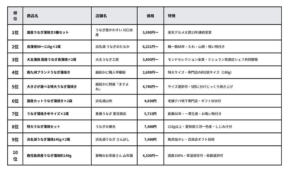 以上が「父の日ギフト 人気うなぎ 売れ筋ランキング TOP10」です。このランキングを通じて、これから迎える暑さに向けて疲労回復に効果的で、夏バテ防止にも役立つうなぎをお父さんへ感謝の気持ちと一緒に贈りませんか。