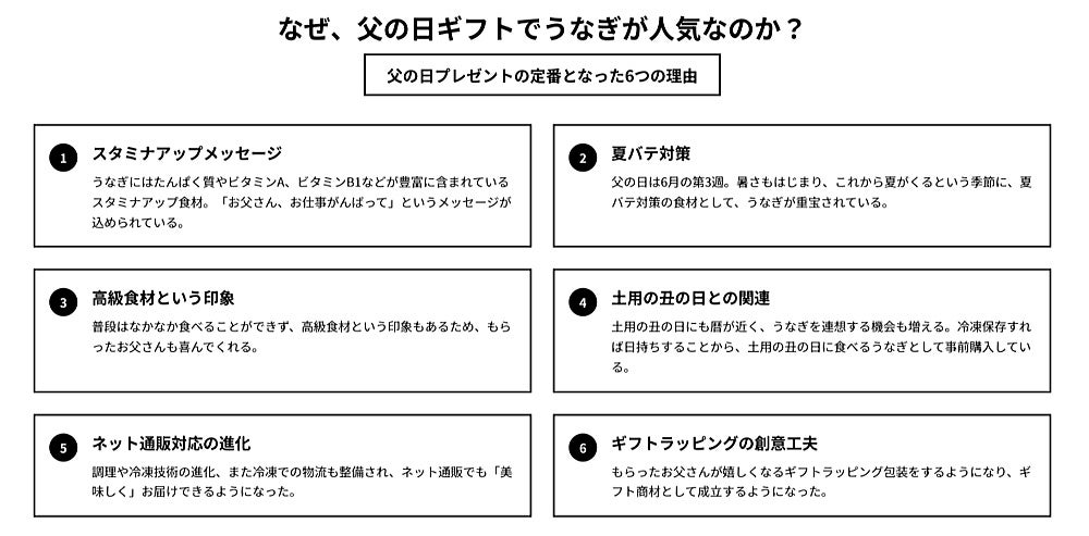 以上、うなぎが父の日ギフトで人気になっている理由、6点があげられると思います。