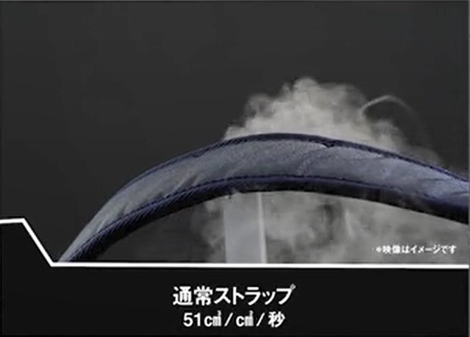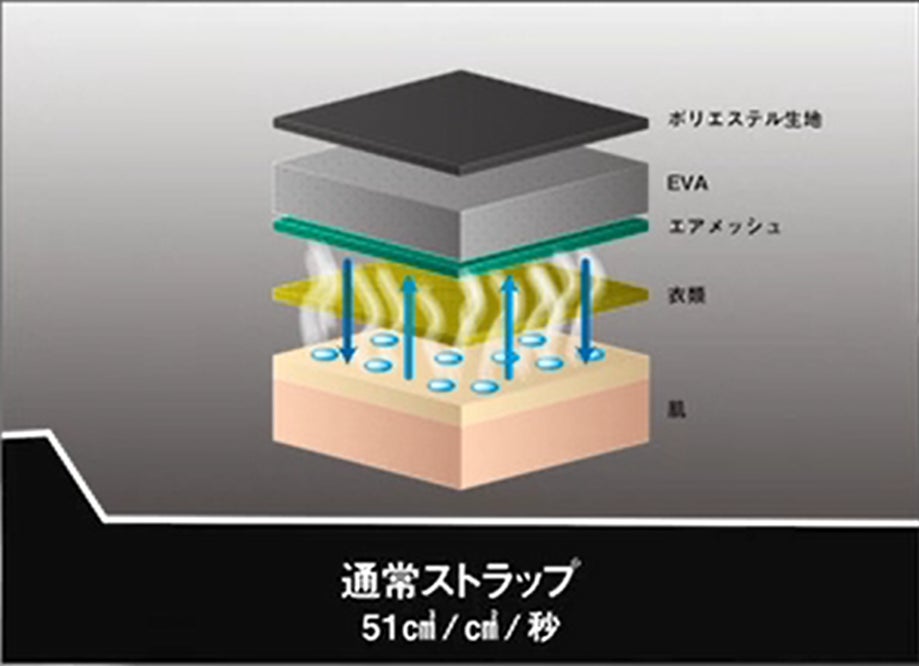 沖縄や四国の梅雨入りが発表※されるなど、ビジネスシーンにおいてもレインアイテムの注目度が高まってきました。お客様からは、「雨天は傘をさしてもバッグが濡れるから撥水性は必須」という声はもちろんのこと「汗ばむ季節のバックパックは、ショルダーベルト部分のムレが気になる」という声も多くあがっています。そこで今回は、昨年発売し好評だったスポーツ技術を搭載したミズノ共同企画のバックパックをさらに進化。前回に引き続き撥水機能性を備えている他、新たに高通気ショルダーベルトを採用し、梅雨の季節や真夏でも快適に使用できるバックパックにしました。このショルダーベルトは、内部に多数の通気孔を施したクッション材に加えて、ショルダーベルトの表側と裏側をメッシュ素材にすることで、人体表面から出る水分(効果や感じ方は状況により異なります)が素早く外に拡散されます。これにより、約4倍の通気量(ミズノ従来品比)を実現し、ショルダーベルト下の汗ジミも軽減します。