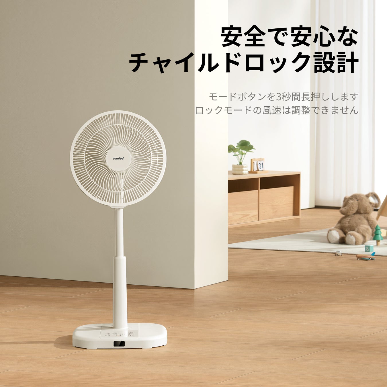 COMFEE' 扇風機は、安全で安心なチャイルドロック設計を採用しています。モードボタンを3秒間長押しすることで、チャイルドロックが有効になり、誤操作を防止します。このロックモードでは、風速の調整ができないため、小さなお子様がいる家庭でも安心して使用できます。これにより、家族全員が安全に快適な風を楽しむことができます。