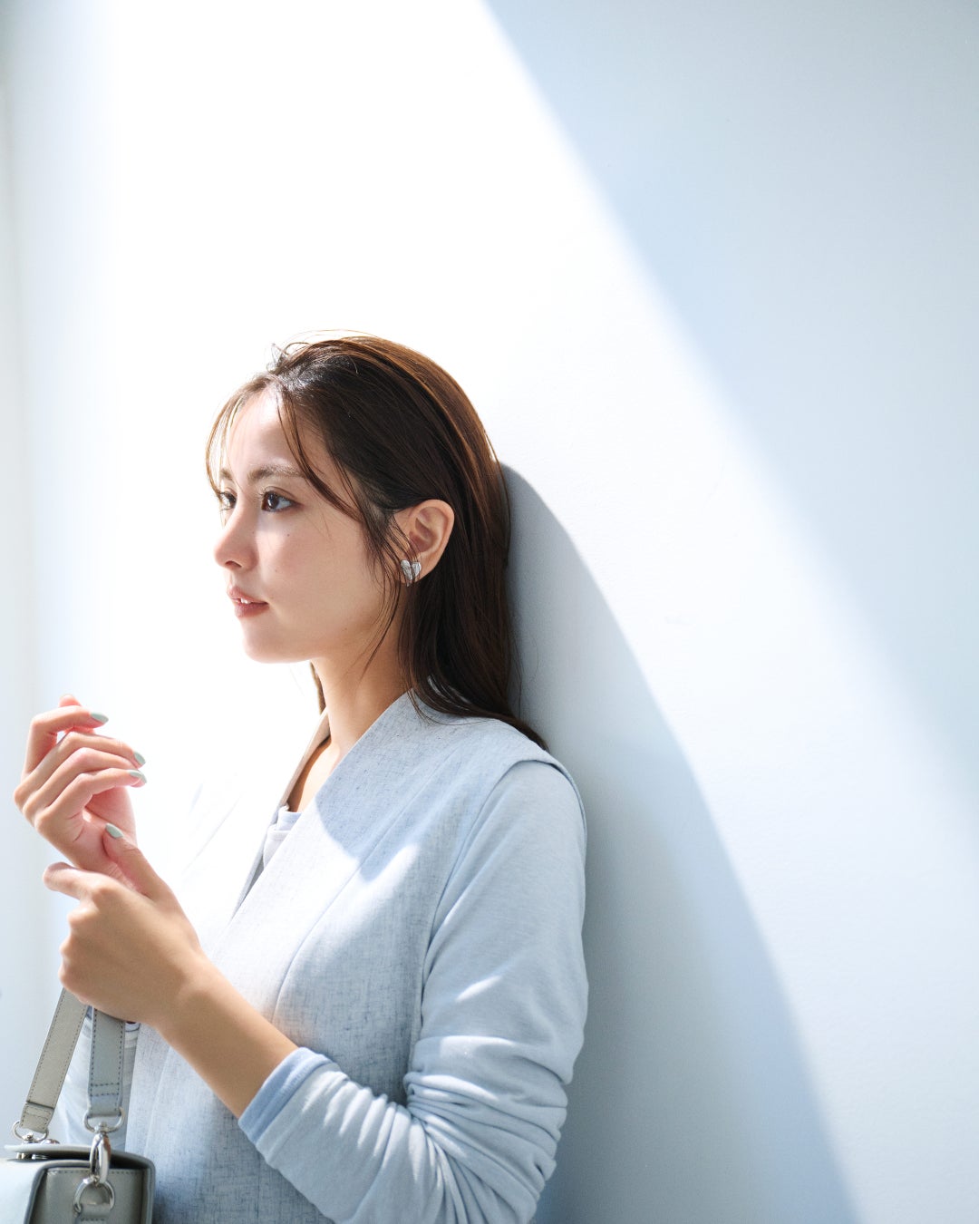 Gilet_ ¥24,200/Inner(Blue)_ ¥10,780/Inner(White)_ ¥10,780/Pants_ ¥19,800/Earrings_ ¥5,280/Bag_ ¥16,500